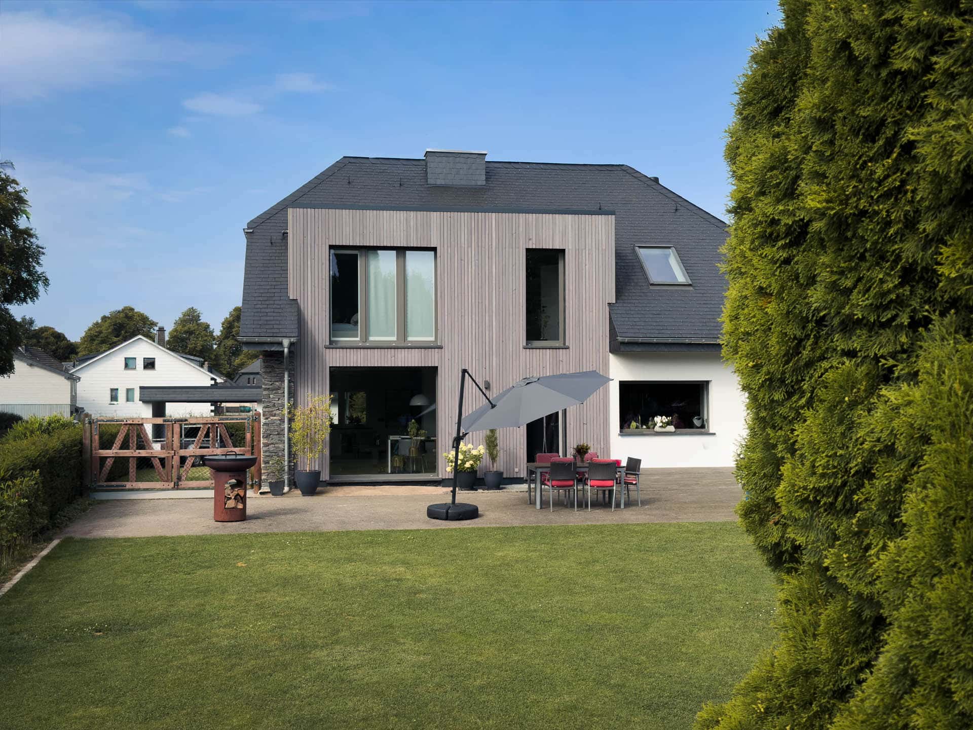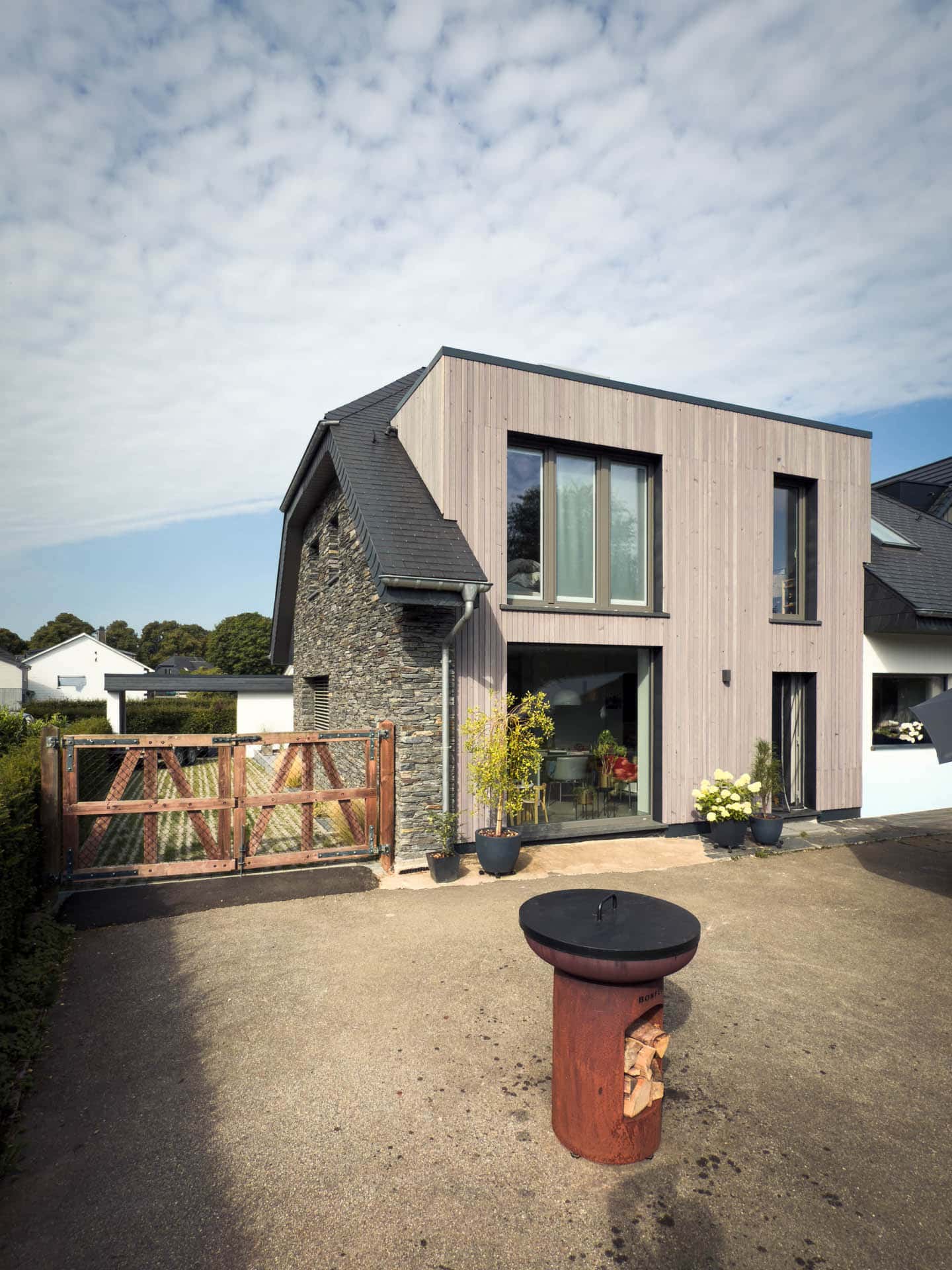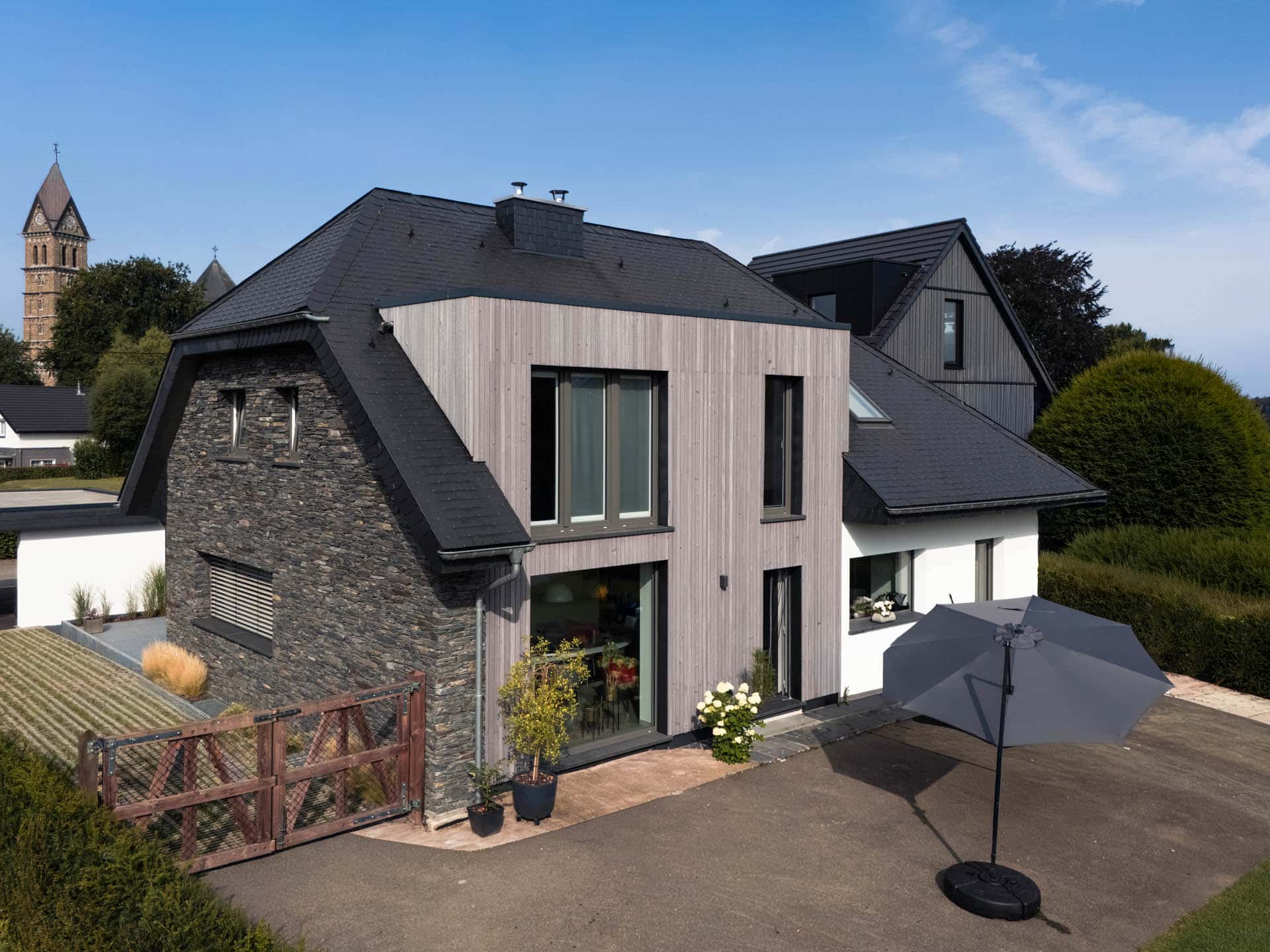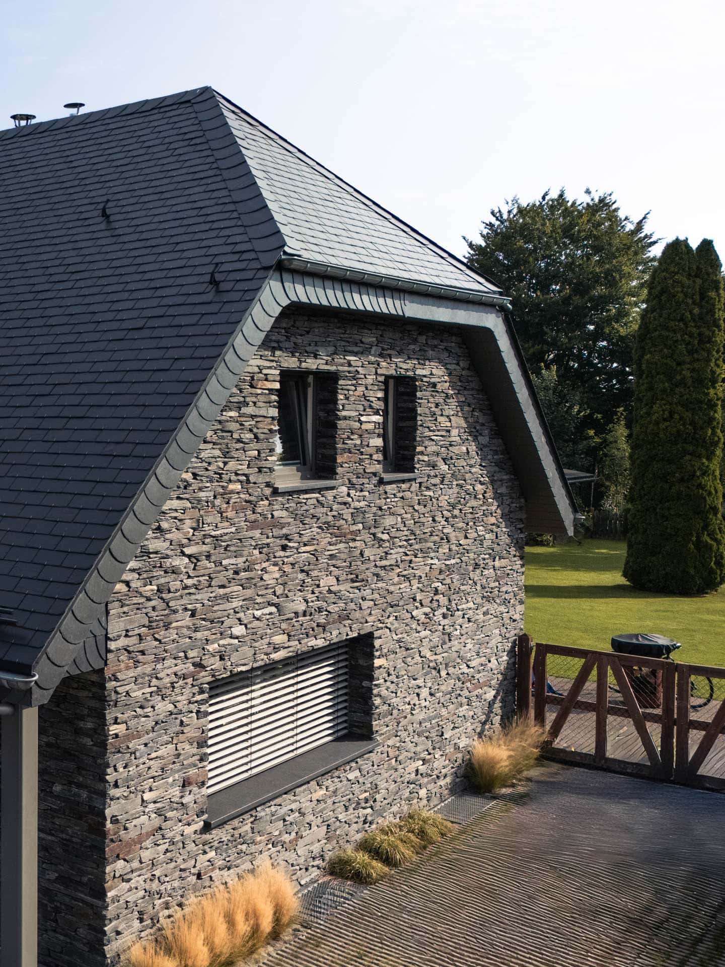 Das bestehende Wohnhaus erstrahlt nach dem Umbau in neuer Harmonie: Charaktervolle Bruchsteine treffen auf klaren weißen Putz und edlen Naturschiefer – ein Zusammenspiel, das zeitlose Eleganz ausstrahlt.