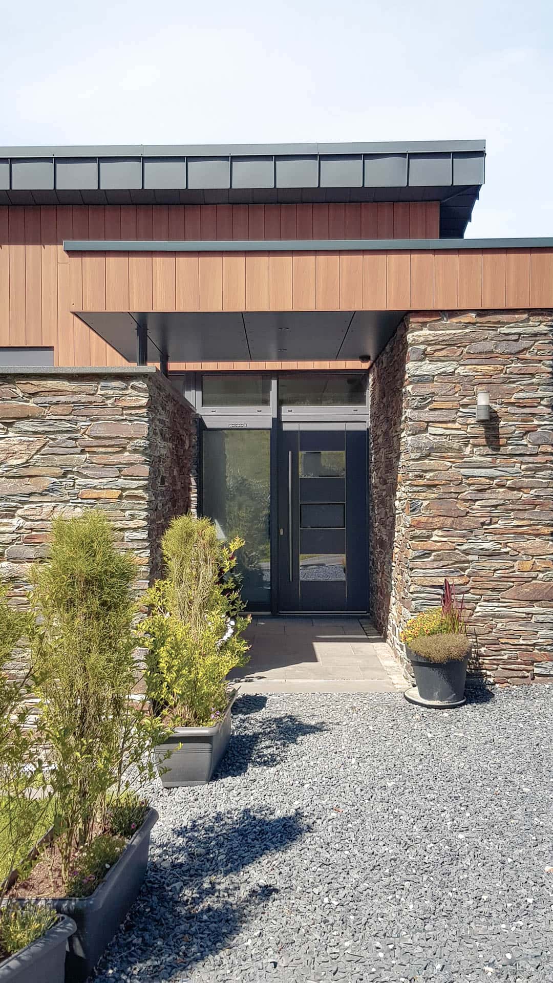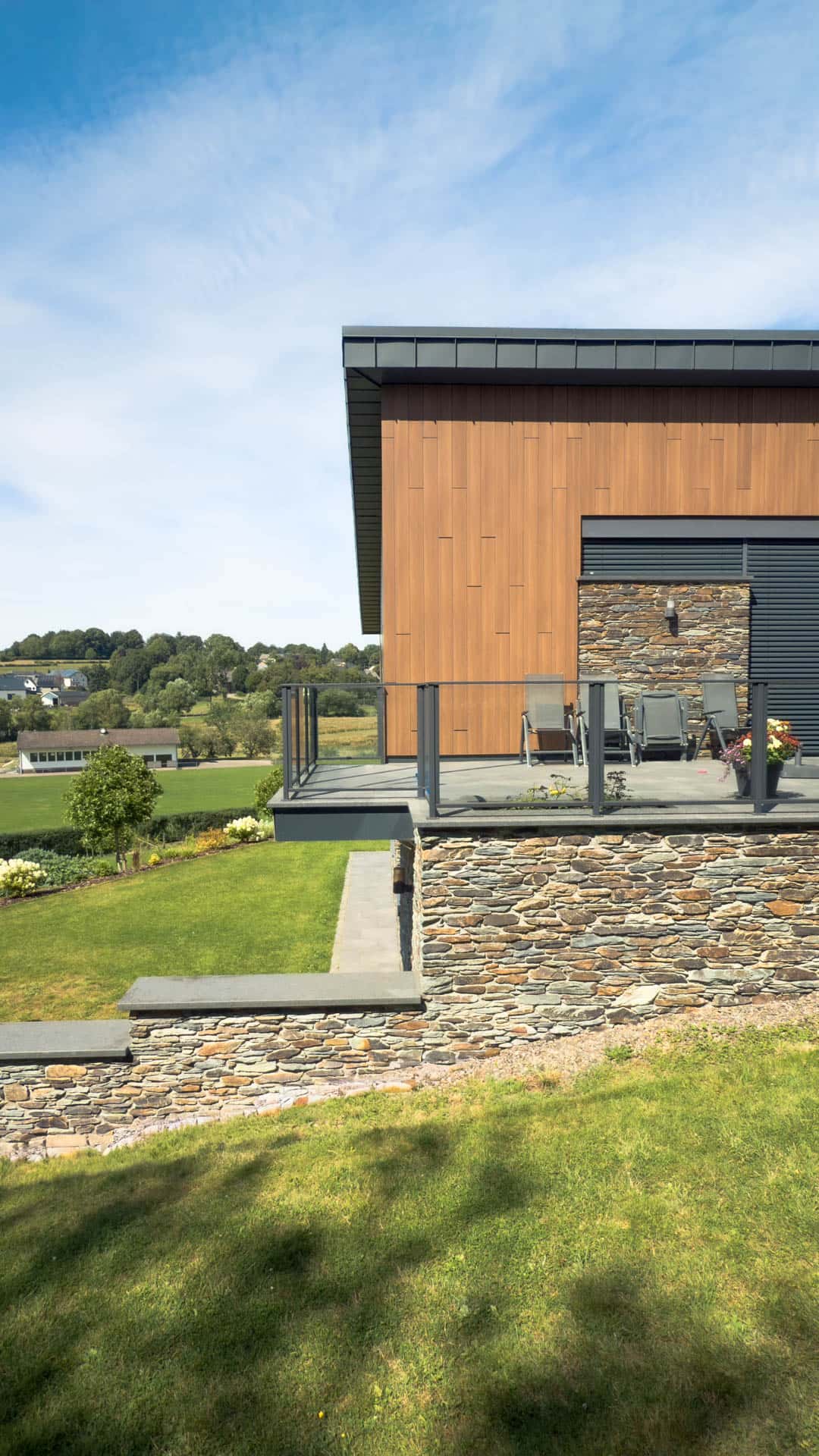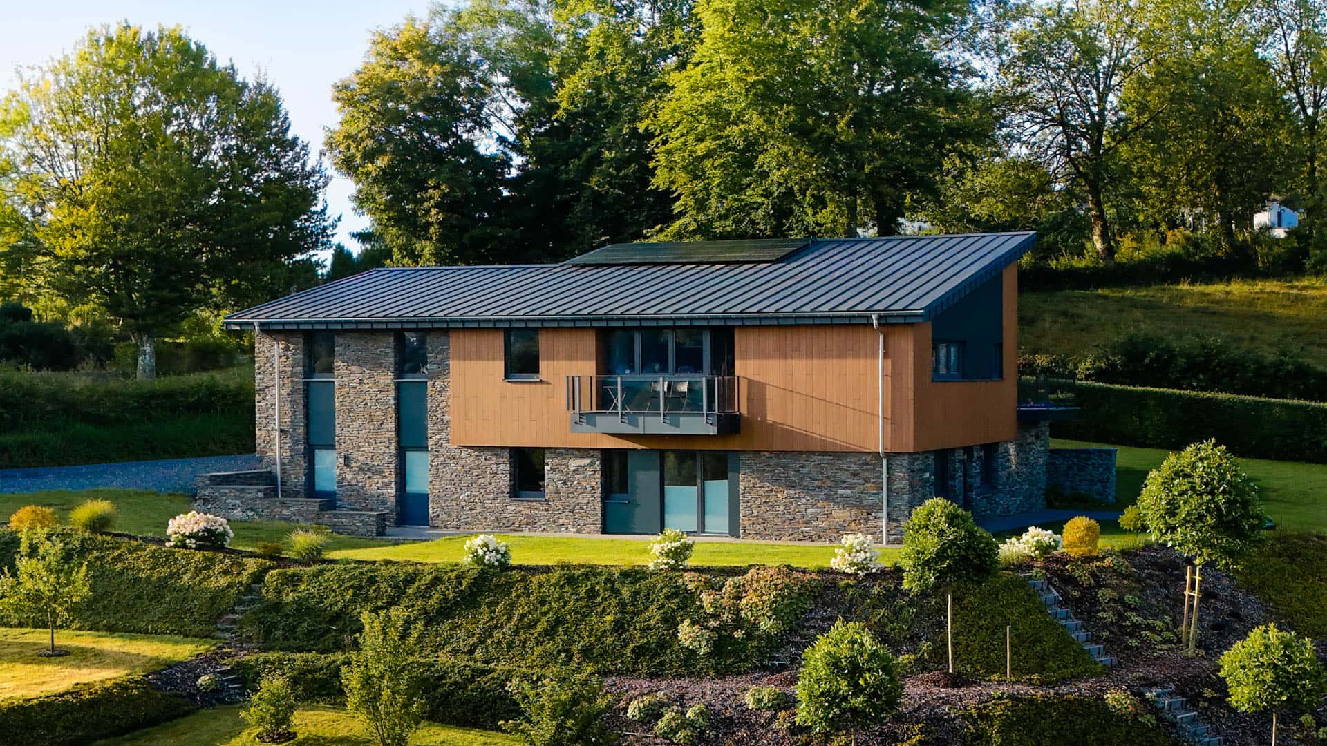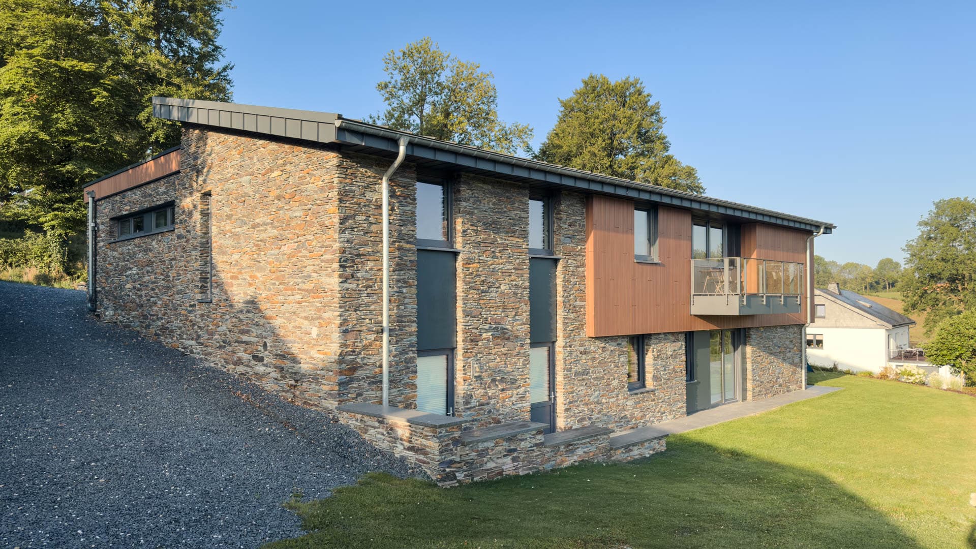 Das Haus fügt sich in den Hang ein, als würden die Bruchsteine direkt aus dem Boden wachsen. Im Untergeschoss liegen die privaten Zimmer, darüber schwebt der offene Wohnraum mit weitem Blick ins Tal. Das Pultdach ist parallel zum Geländerelief und unterstreicht die horizontale und flache Ausrichtung des Baukörpers.