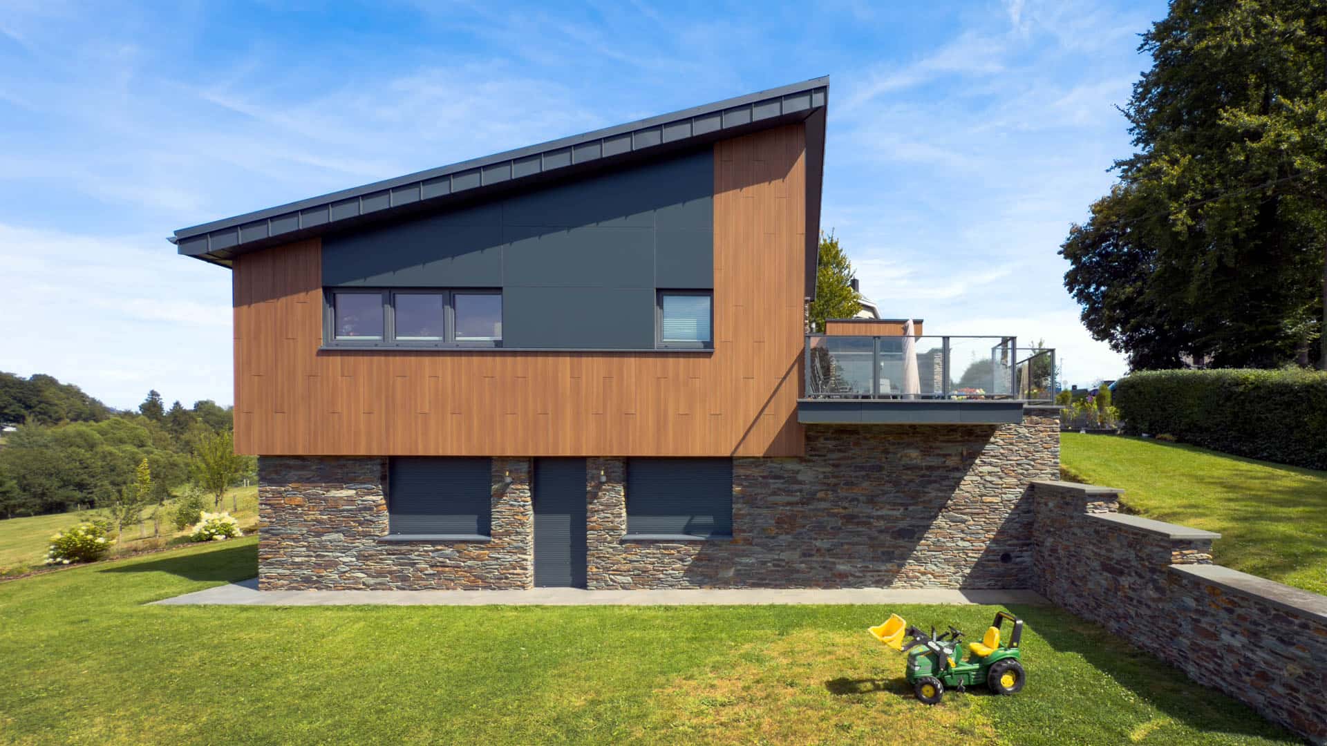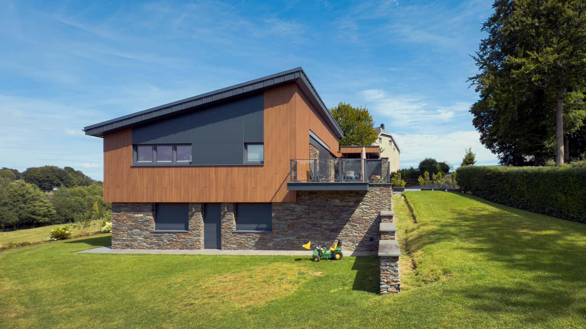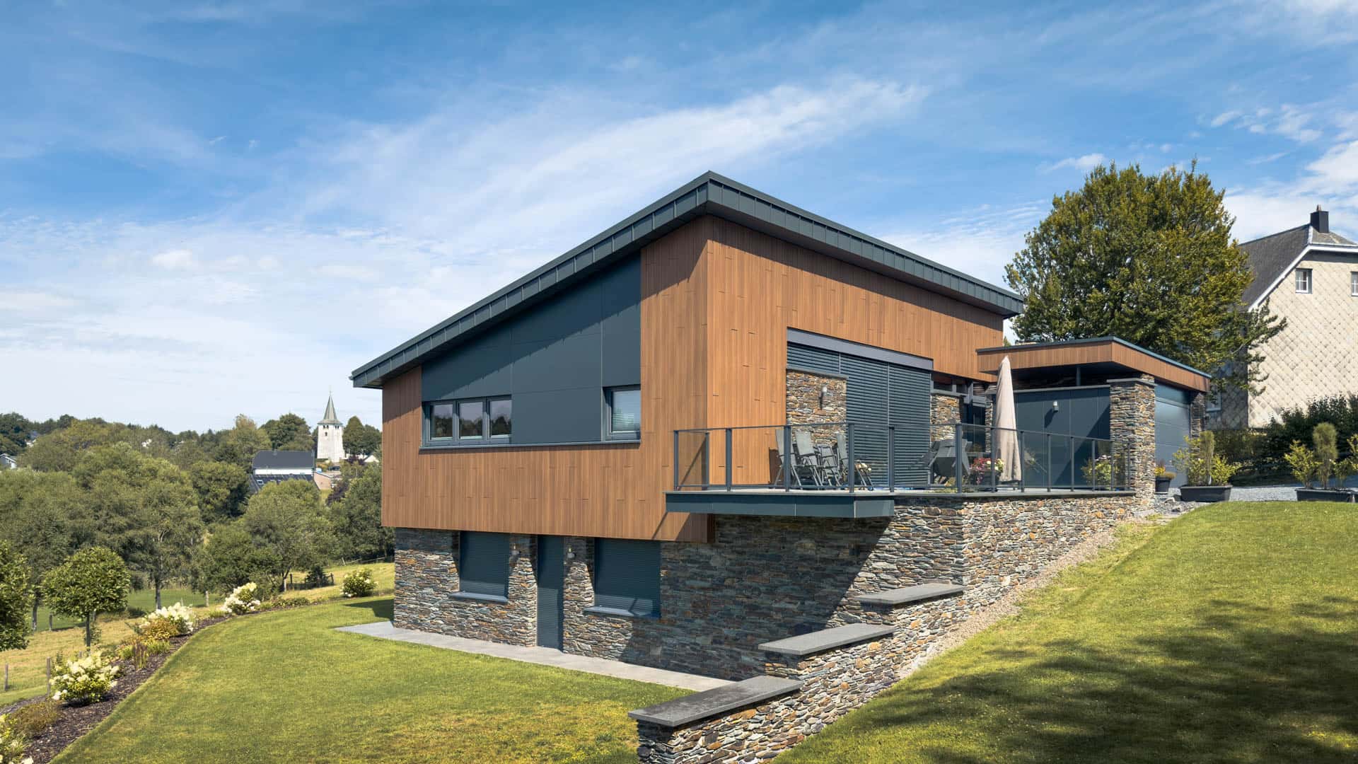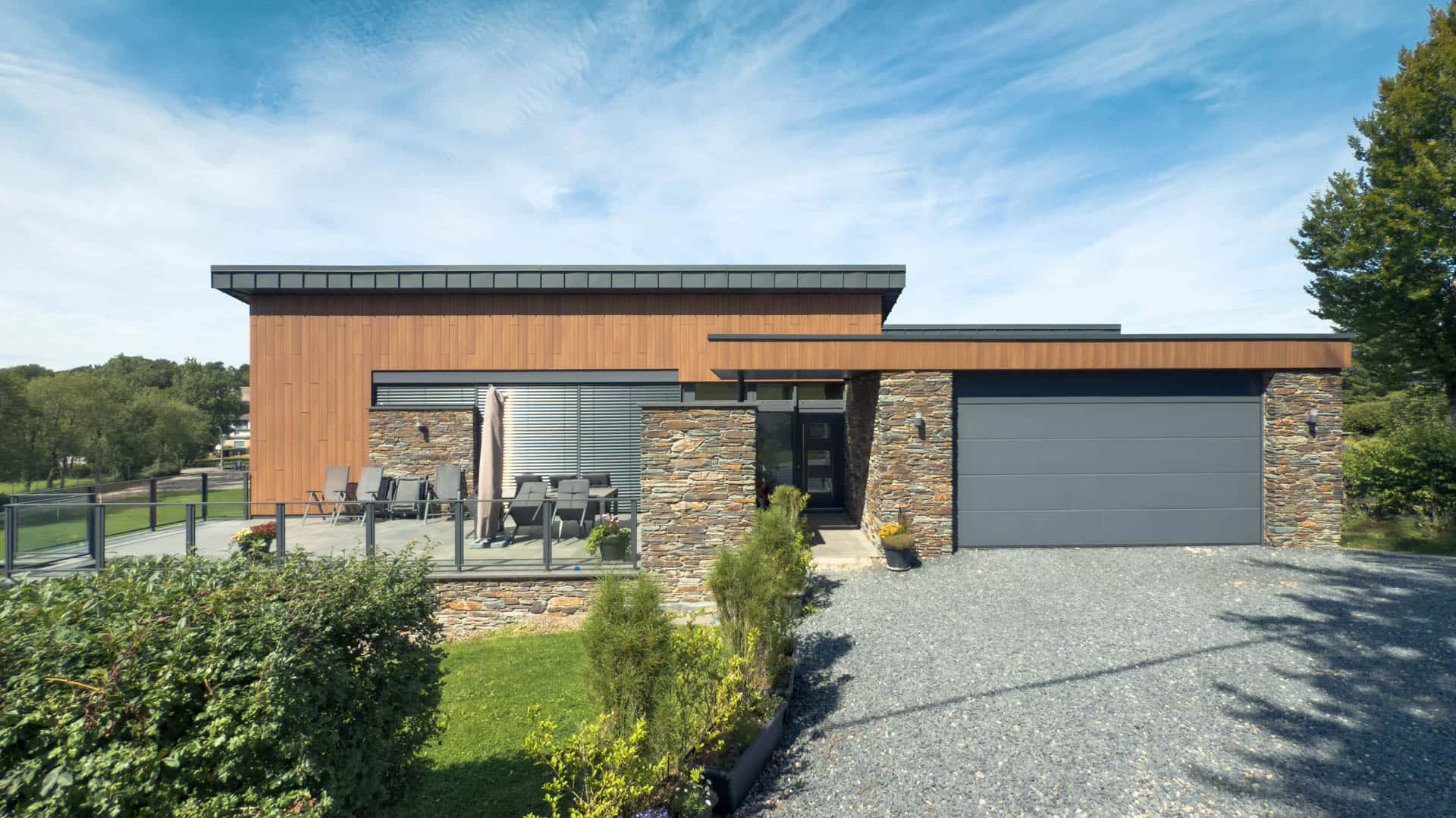 Das Haus fügt sich in den Hang ein, als würden die Bruchsteine direkt aus dem Boden wachsen. Im Untergeschoss liegen die privaten Zimmer, darüber schwebt der offene Wohnraum mit weitem Blick ins Tal. Das Pultdach ist parallel zum Geländerelief und unterstreicht die horizontale und flache Ausrichtung des Baukörpers.