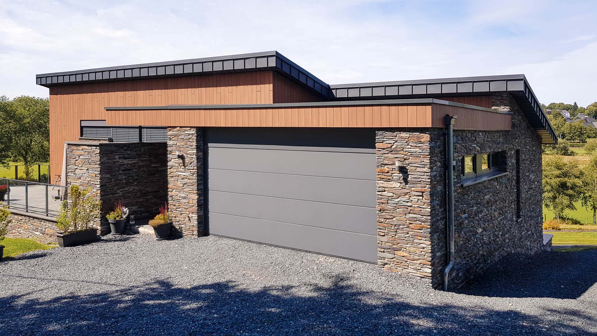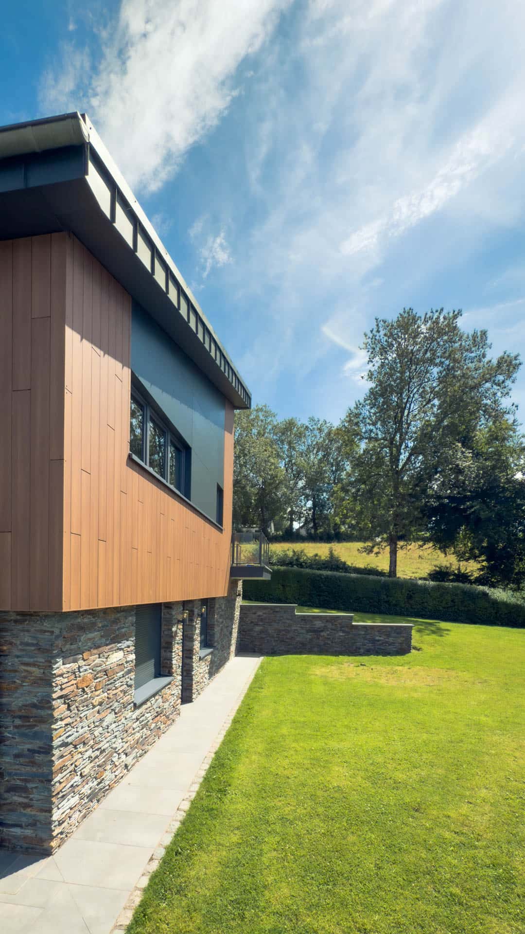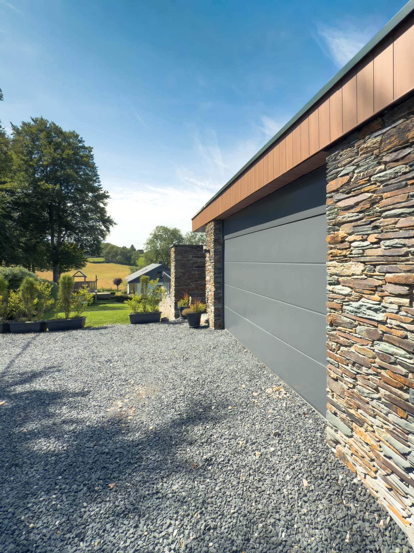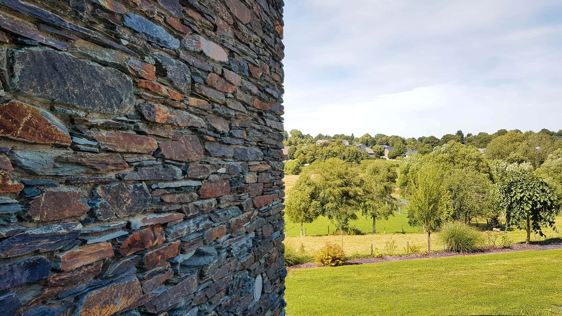 Das Haus fügt sich in den Hang ein, als würden die Bruchsteine direkt aus dem Boden wachsen. Im Untergeschoss liegen die privaten Zimmer, darüber schwebt der offene Wohnraum mit weitem Blick ins Tal. Das Pultdach ist parallel zum Geländerelief und unterstreicht die horizontale und flache Ausrichtung des Baukörpers.