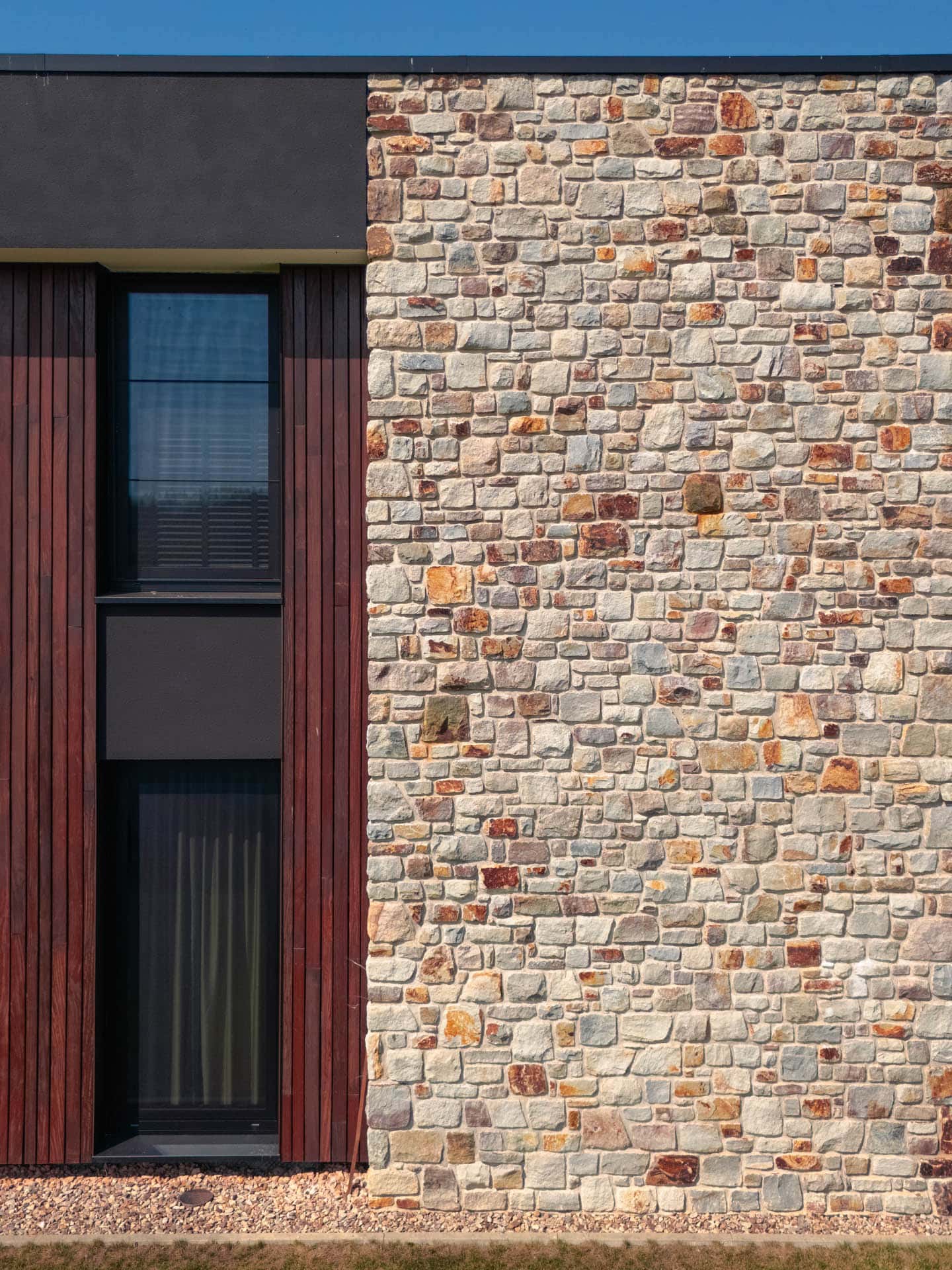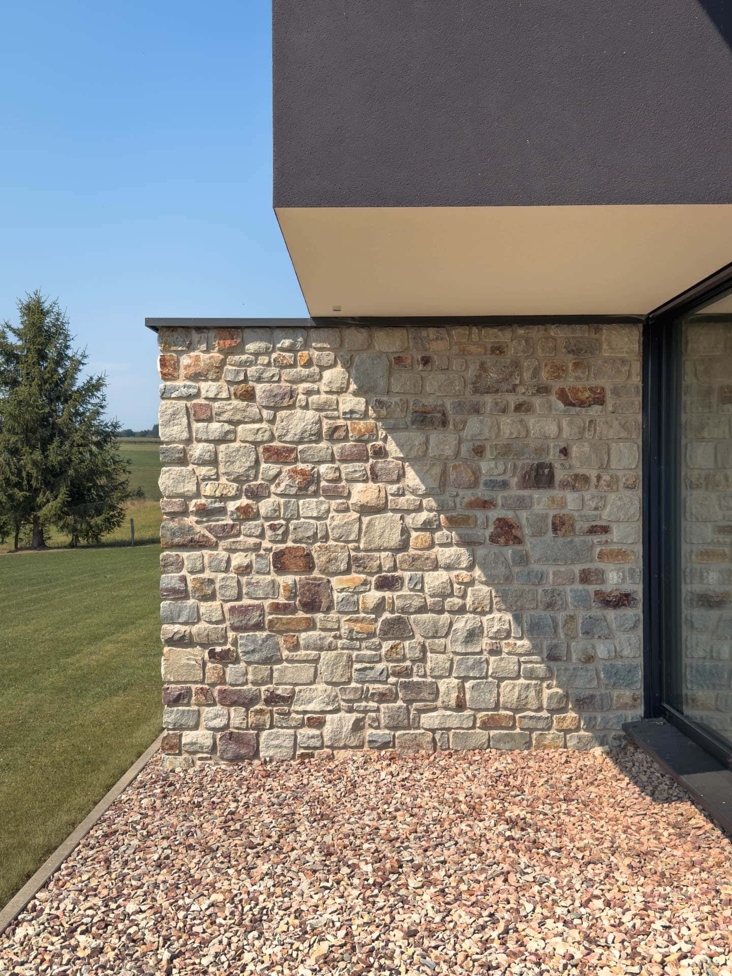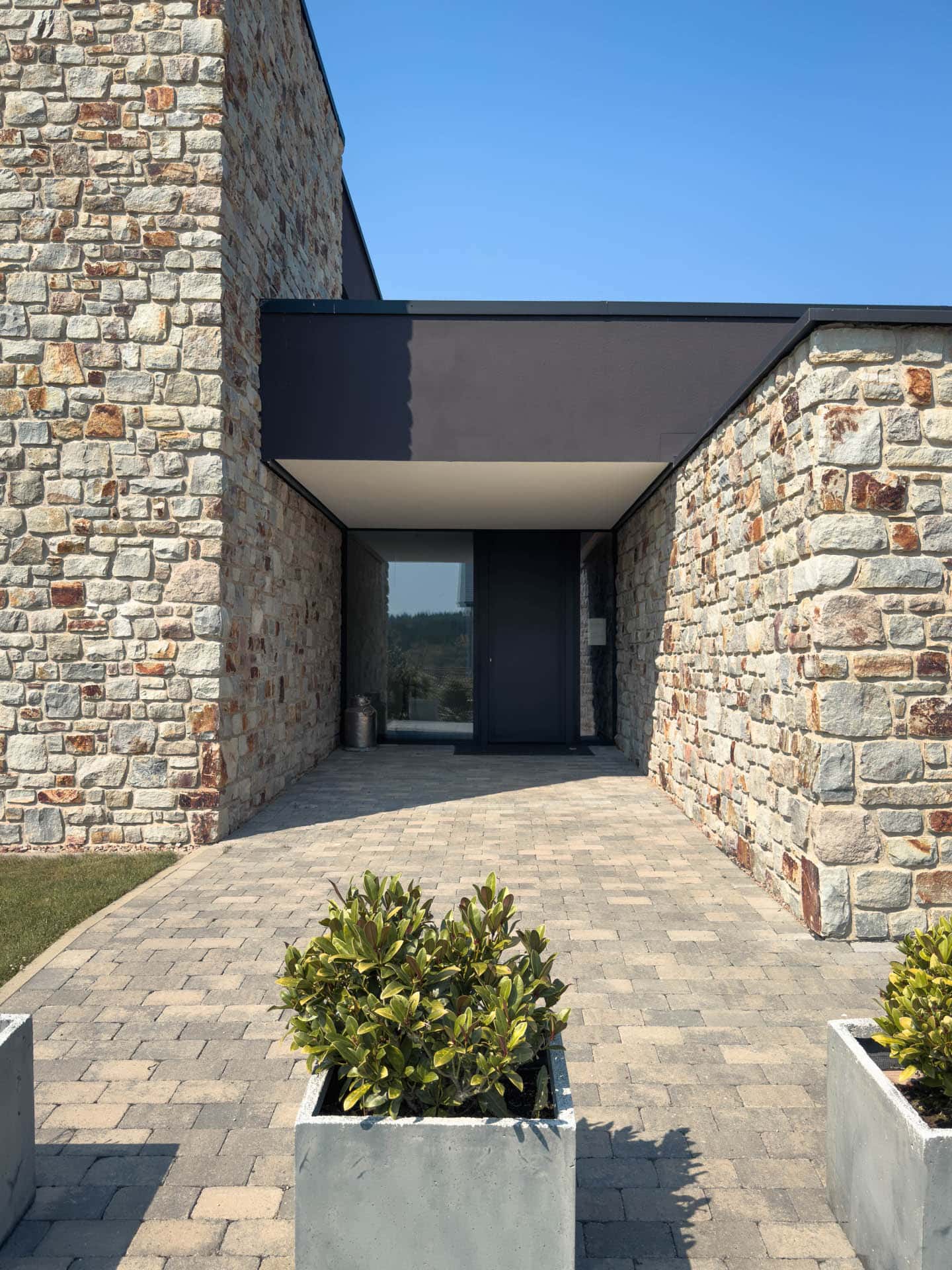 und erlauben lichtdurchflutete Innenräume. Helle Bruchsteinwände unterteilen die Räume während