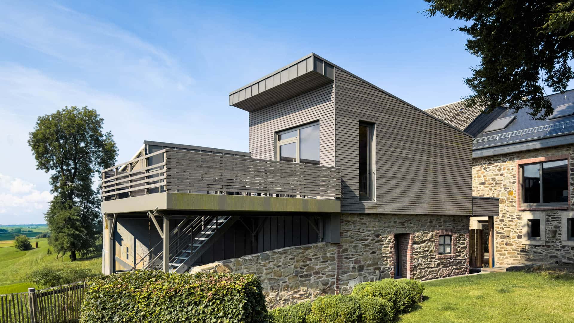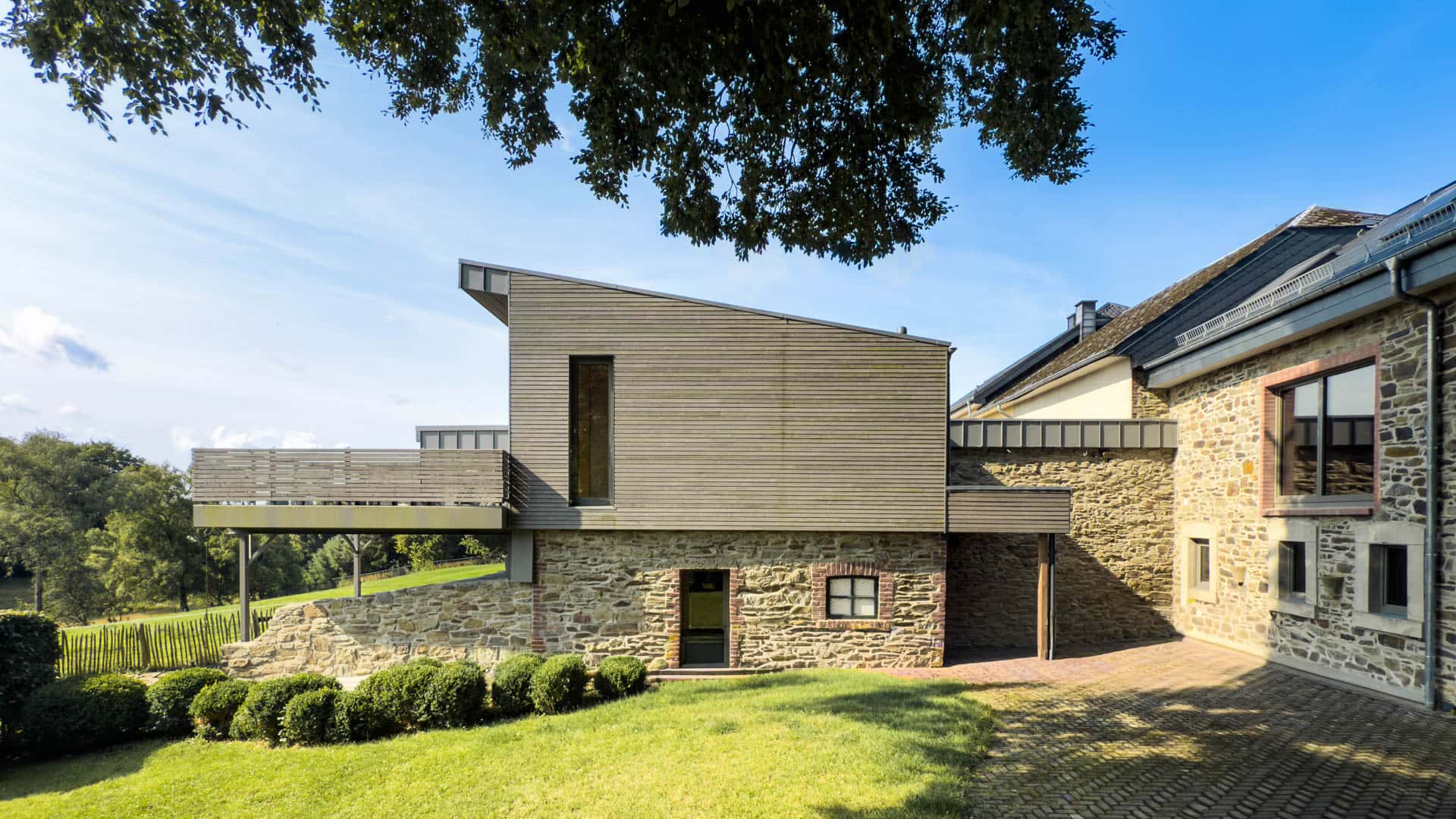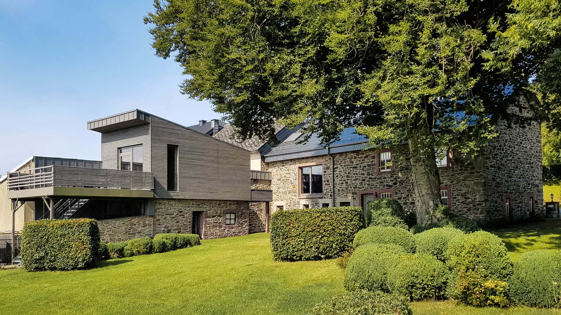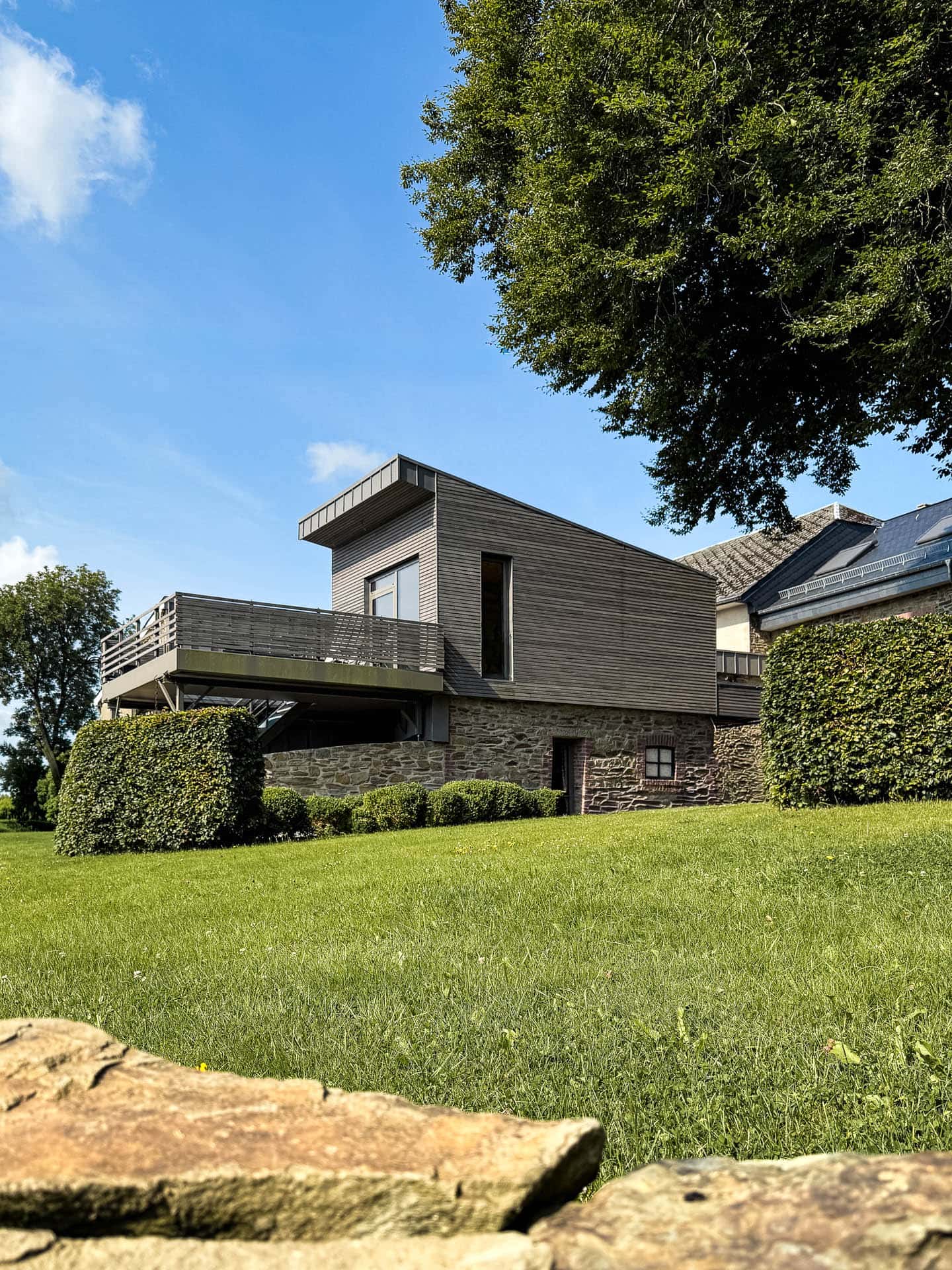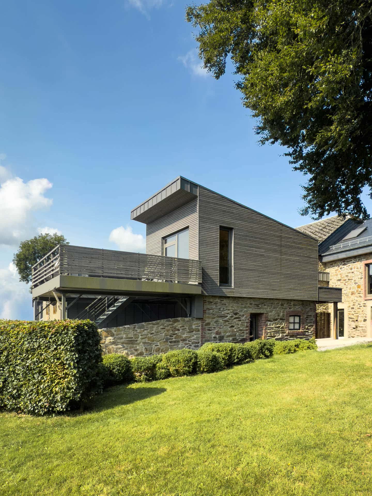 Altehrwürdiges Wohnhaus mit typischen Formen, renoviert und in zwei Wohnungen gegliedert. Hinzu kommt ein Anbau in modernen Formen, nach Süden ausgerichtet und mit grauer, horizontaler Holzverschalung, der eine kleine Ferienwohnung beherbergt und als Oase in der Natur wirkt. Eine frei schwebende Terrasse macht das Naturerlebnis perfekt.