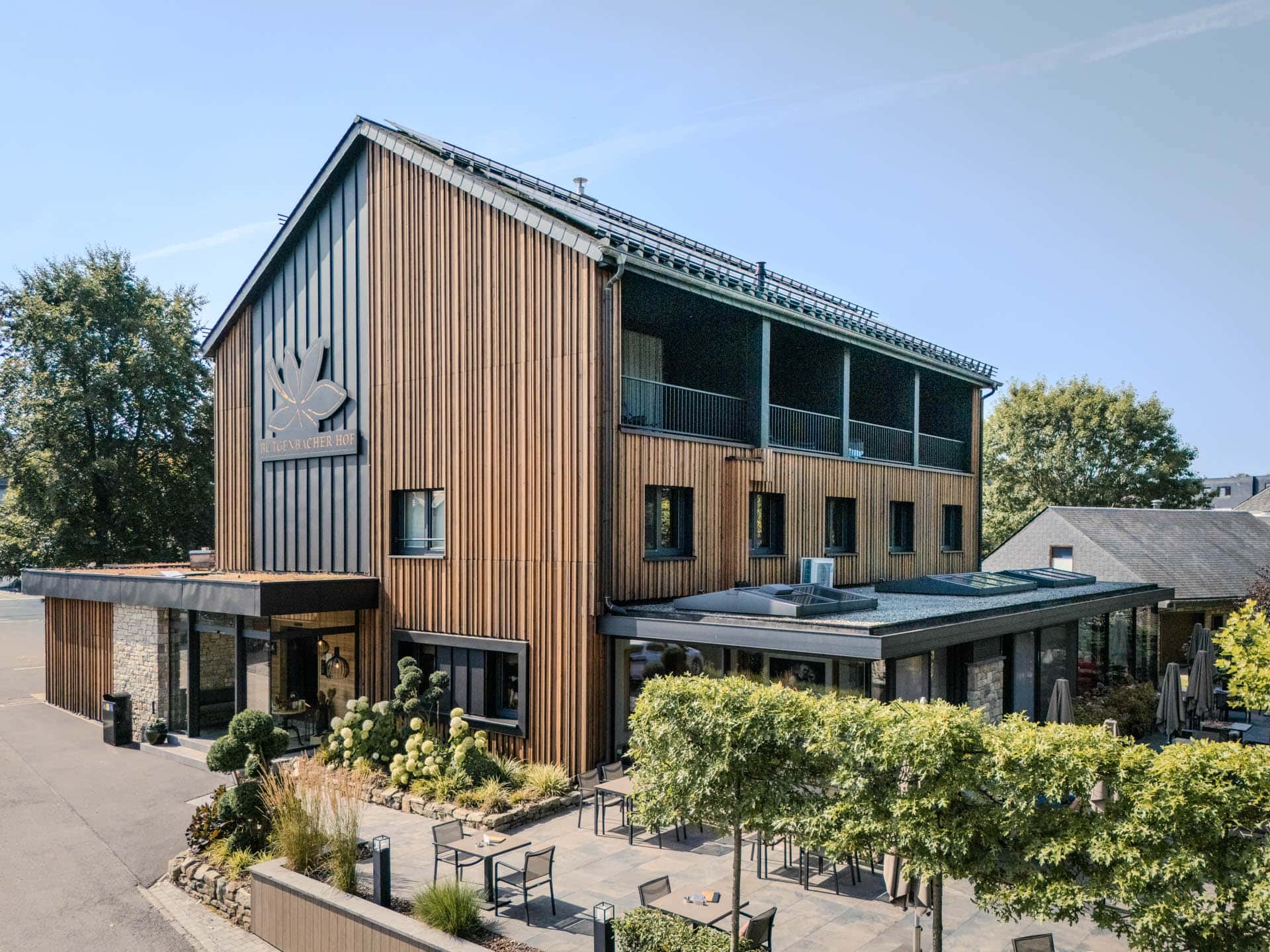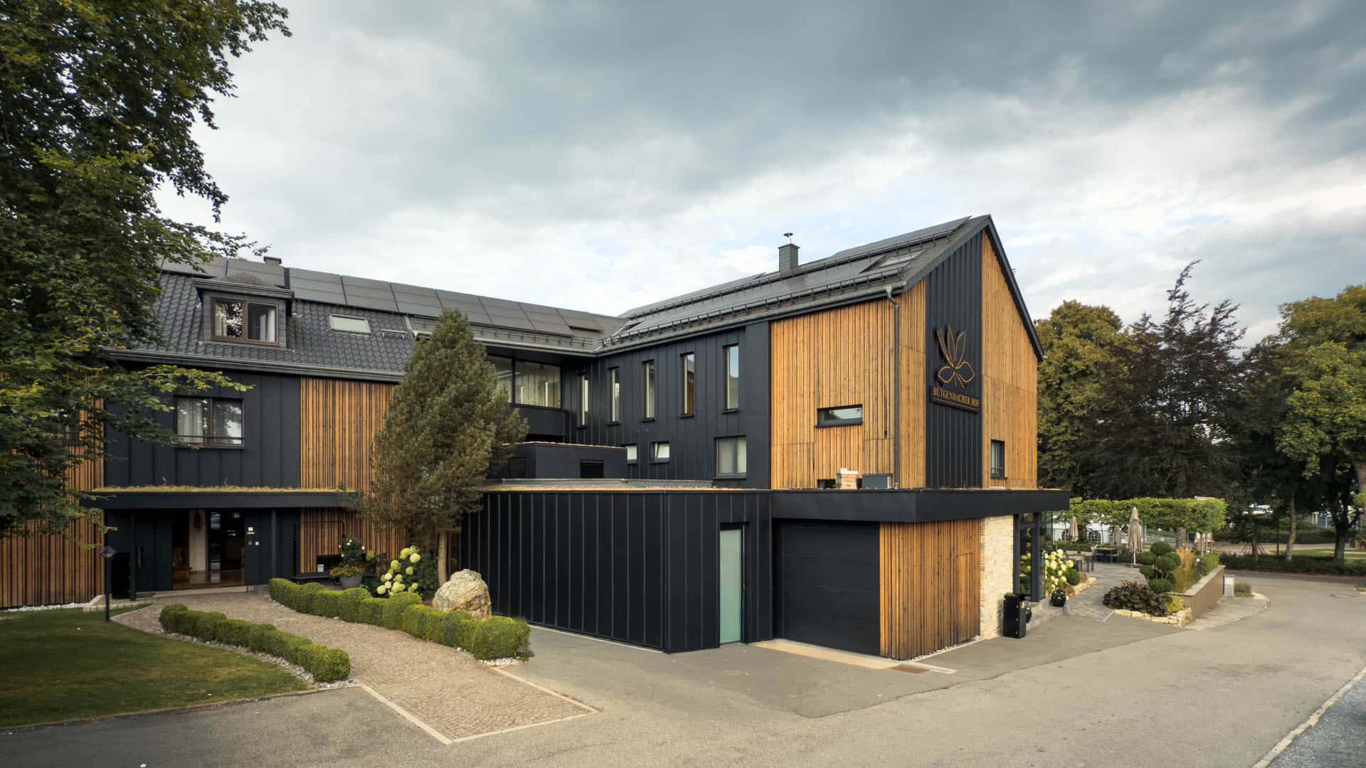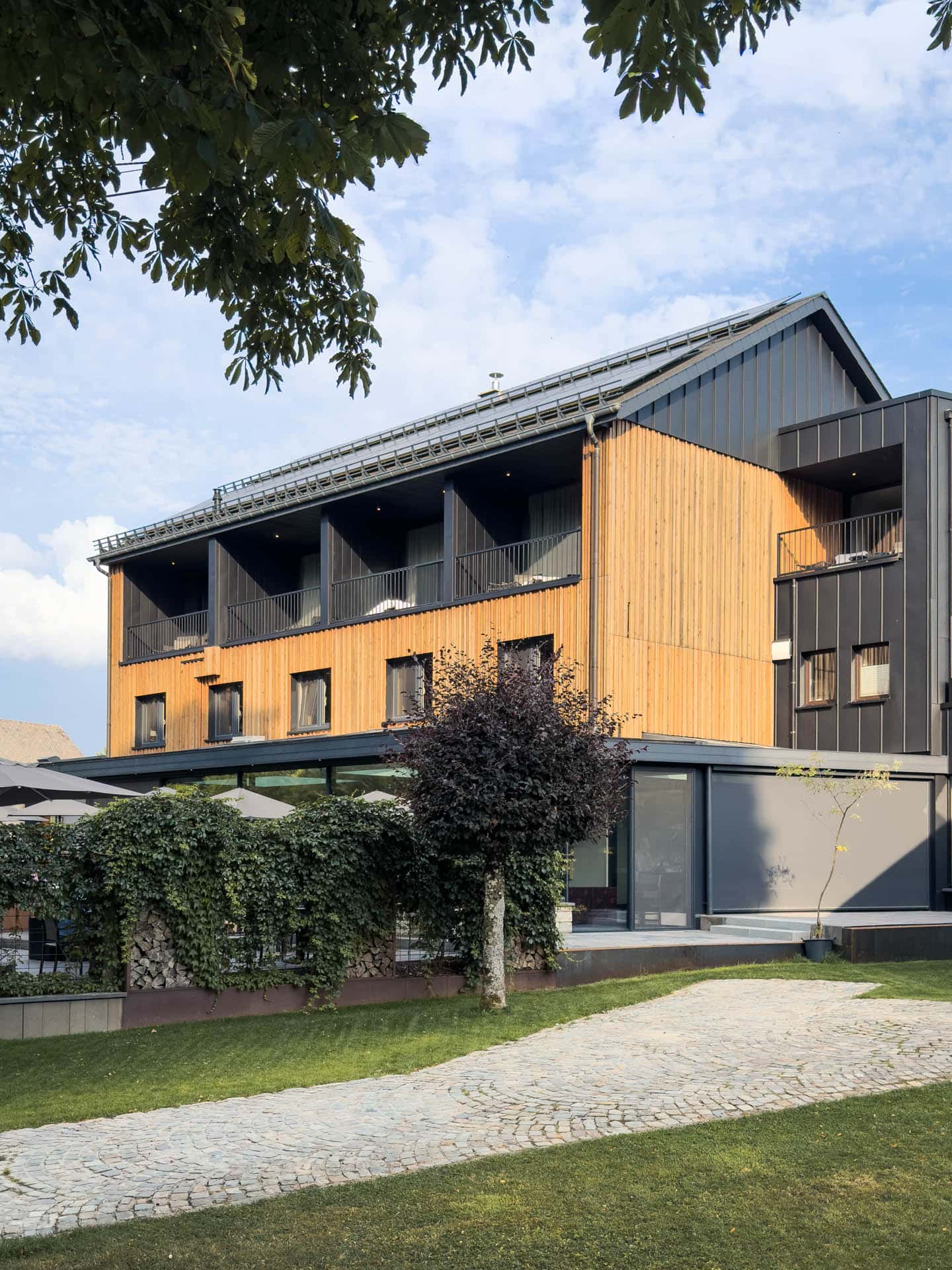 Das klare Volumen des Baukörpers bleibt dank Satteldach und zurückhaltender Balkone ungestört. Außen prägen Naturholz und Stahlblech in Stehfalzoptik das Erscheinungsbild. Innen schaffen Echtholz und helle Oberflächen ein modernes, zugleich gemütliches Ambiente – ein Ort zum Wohlfühlen, Loslassen und Entspannen.