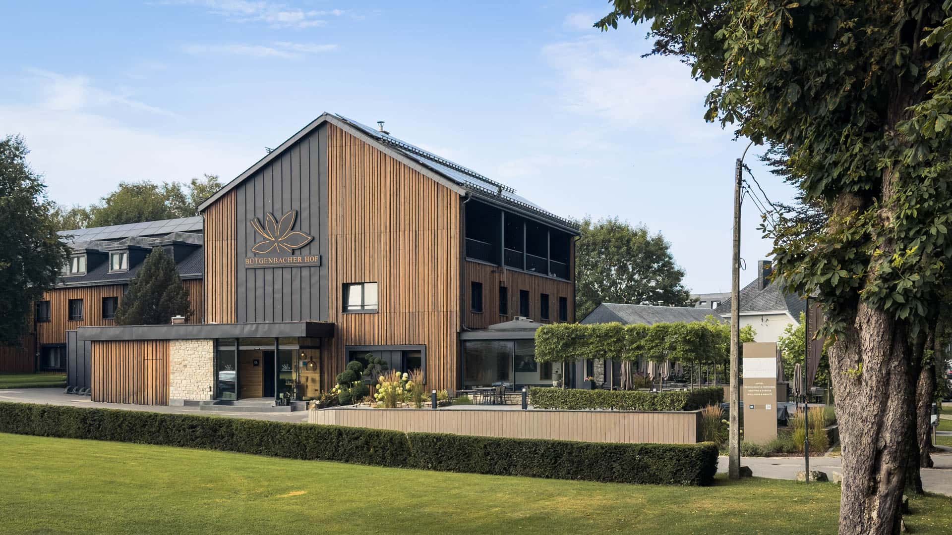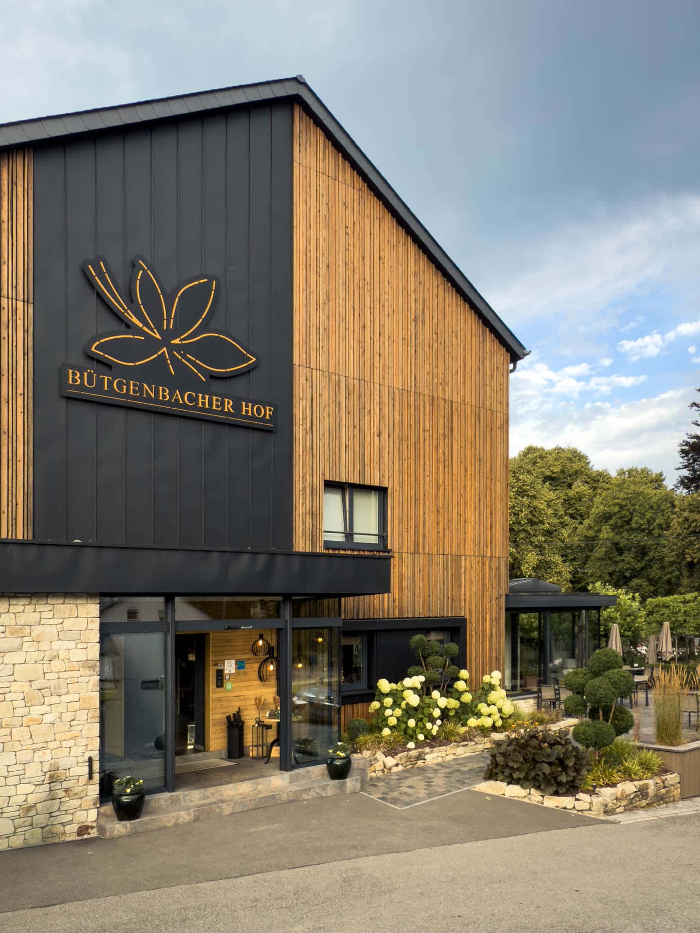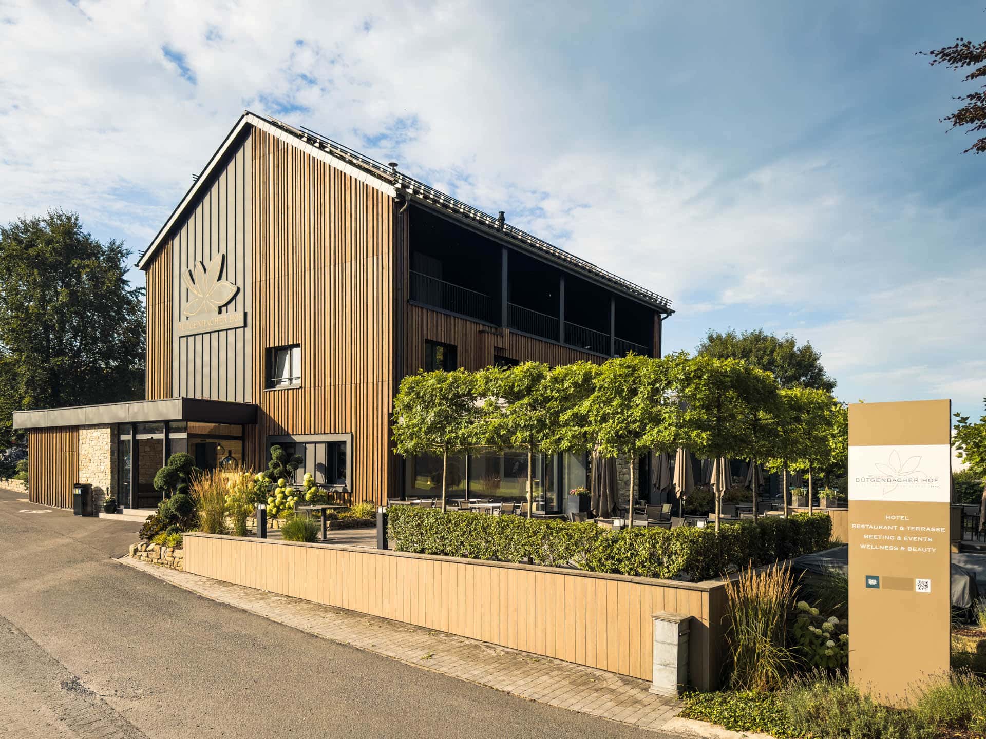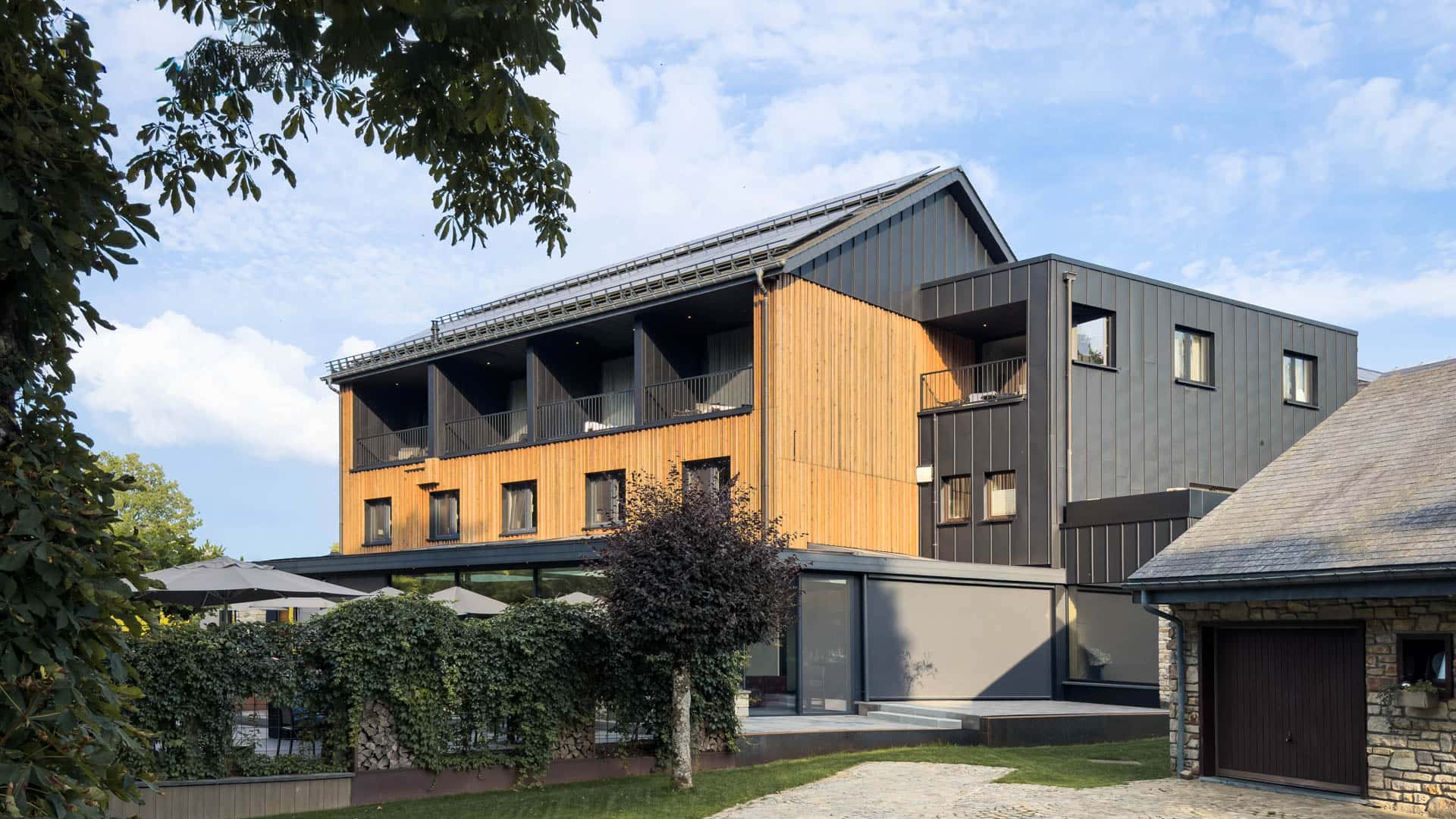 Das klare Volumen des Baukörpers bleibt dank Satteldach und zurückhaltender Balkone ungestört. Außen prägen Naturholz und Stahlblech in Stehfalzoptik das Erscheinungsbild. Innen schaffen Echtholz und helle Oberflächen ein modernes, zugleich gemütliches Ambiente – ein Ort zum Wohlfühlen, Loslassen und Entspannen.