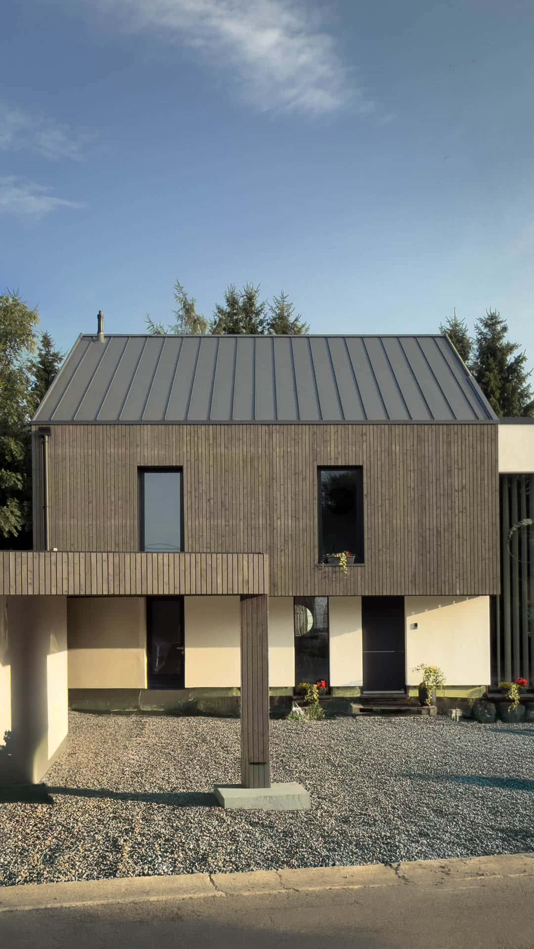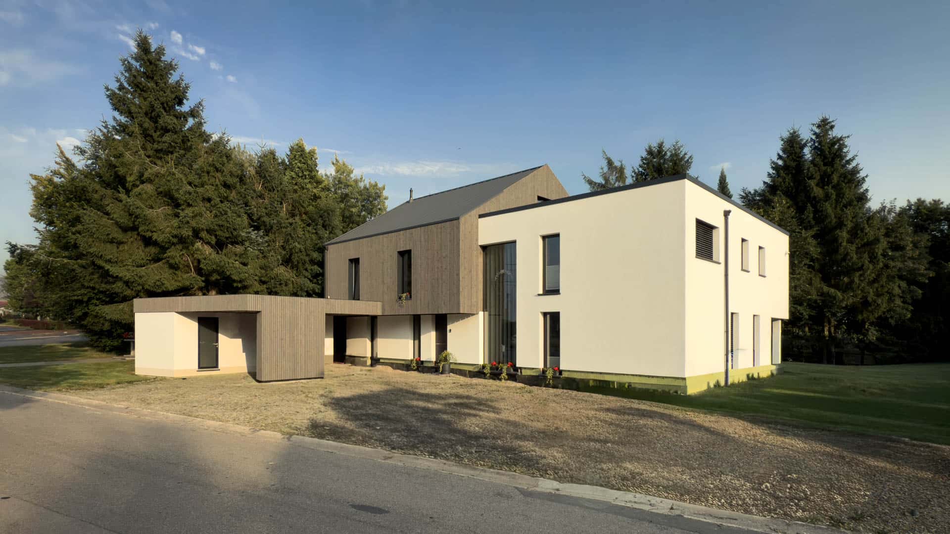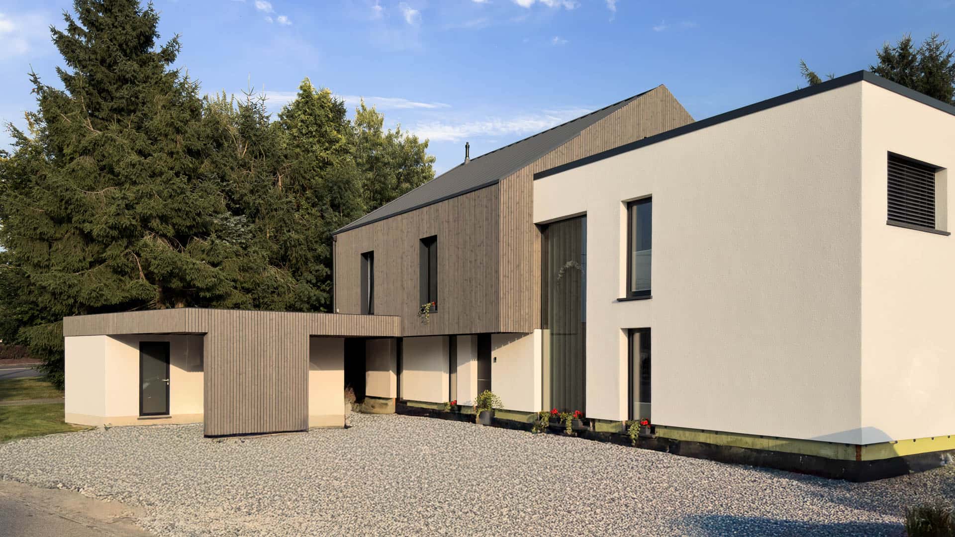 Bei diesem Umbauprojekt treffen traditionelle und moderne Elemente aufeinander: Das klassische Satteldach wird durch einen puristischen Kubus ergänzt. Klare Linien, minimalistische Volumen und der Verzicht auf Dachüberstände prägen die äußere Erscheinung. Senkrecht angeordnetes Holz verleiht Wärme, während weißer Putz für eine helle, freundliche Wirkung sorgt. Wo einst das Scheunentor war, öffnet heute eine große, vertikale Fensterfront den Baukörper. Sie bringt großzügig Licht in den Innenraum und schafft eine eindrucksvolle Verbindung von Flur und Galerie bis hin zu Küche und Wohnbereich.