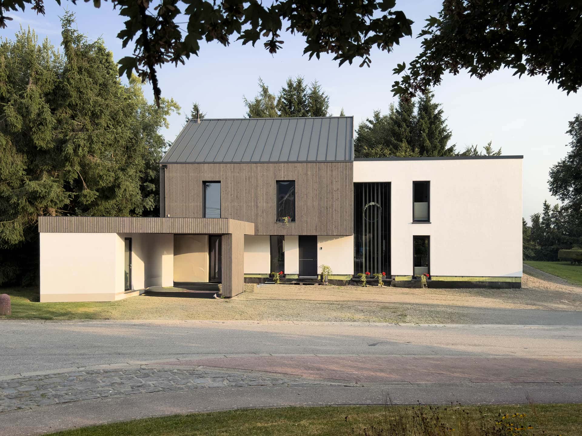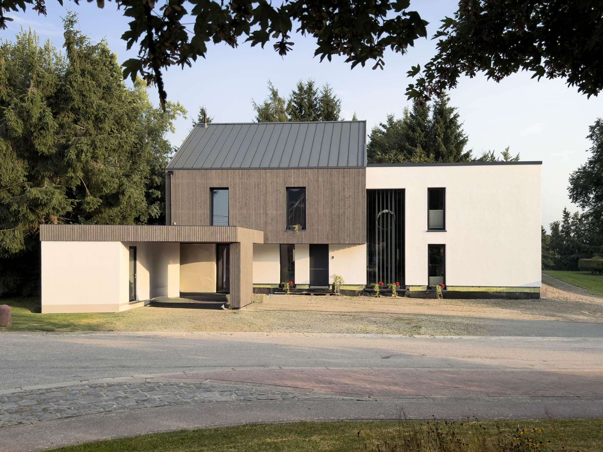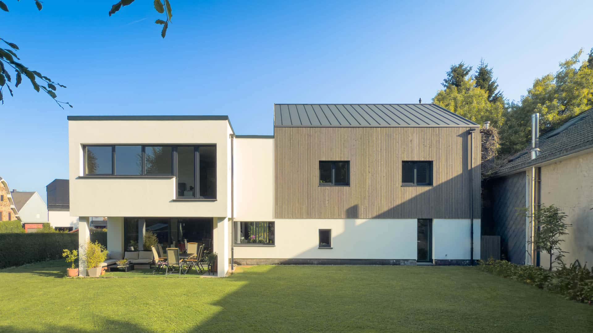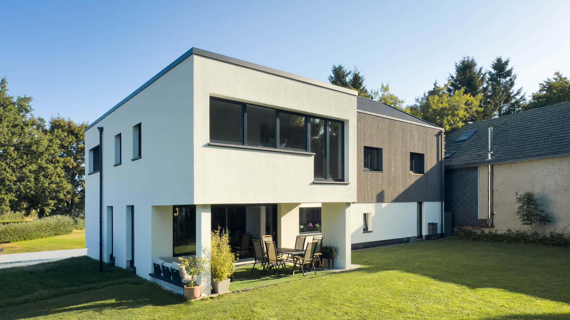 Bei diesem Umbauprojekt treffen traditionelle und moderne Elemente aufeinander: Das klassische Satteldach wird durch einen puristischen Kubus ergänzt. Klare Linien, minimalistische Volumen und der Verzicht auf Dachüberstände prägen die äußere Erscheinung. Senkrecht angeordnetes Holz verleiht Wärme, während weißer Putz für eine helle, freundliche Wirkung sorgt. Wo einst das Scheunentor war, öffnet heute eine große, vertikale Fensterfront den Baukörper. Sie bringt großzügig Licht in den Innenraum und schafft eine eindrucksvolle Verbindung von Flur und Galerie bis hin zu Küche und Wohnbereich.