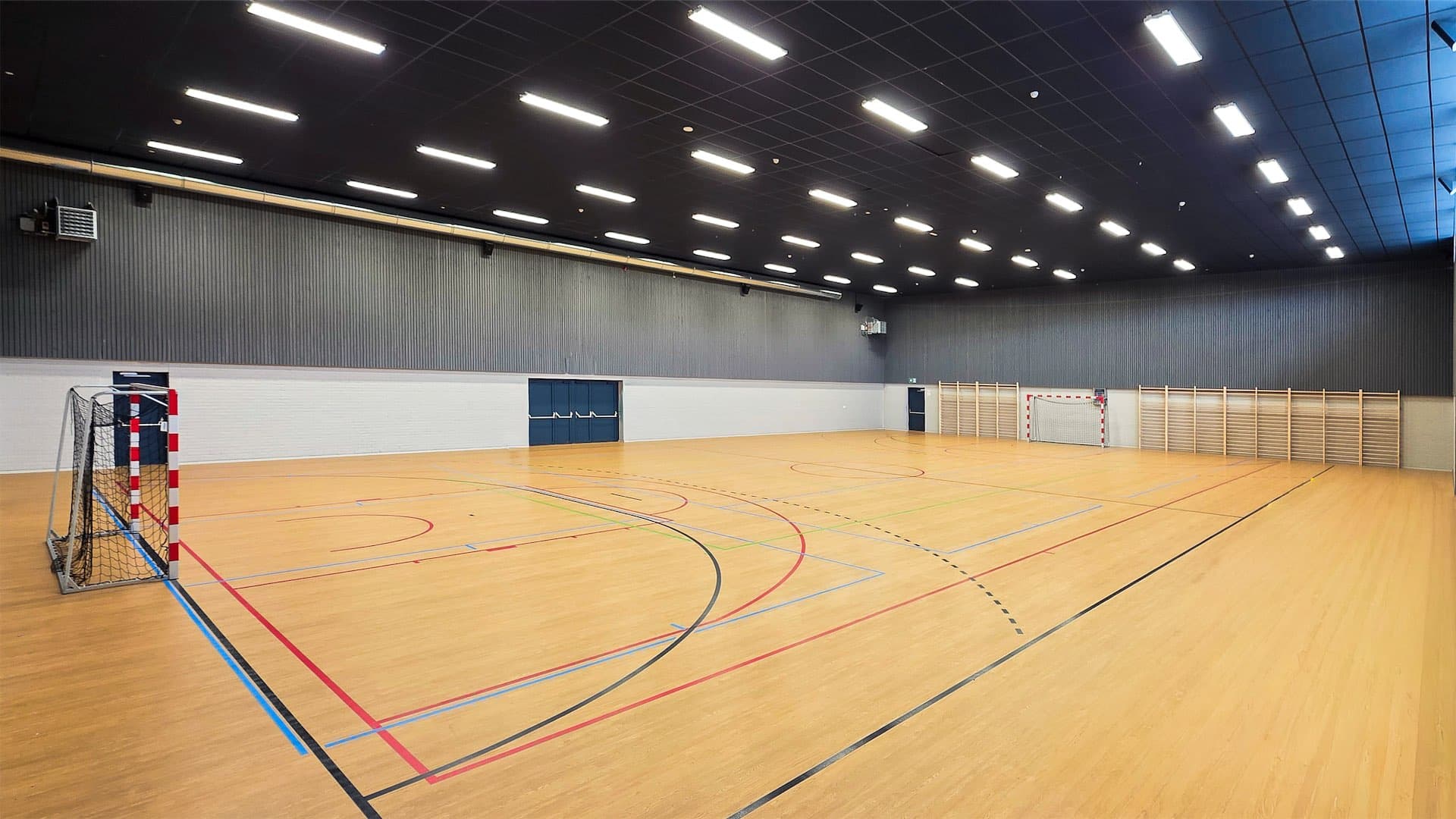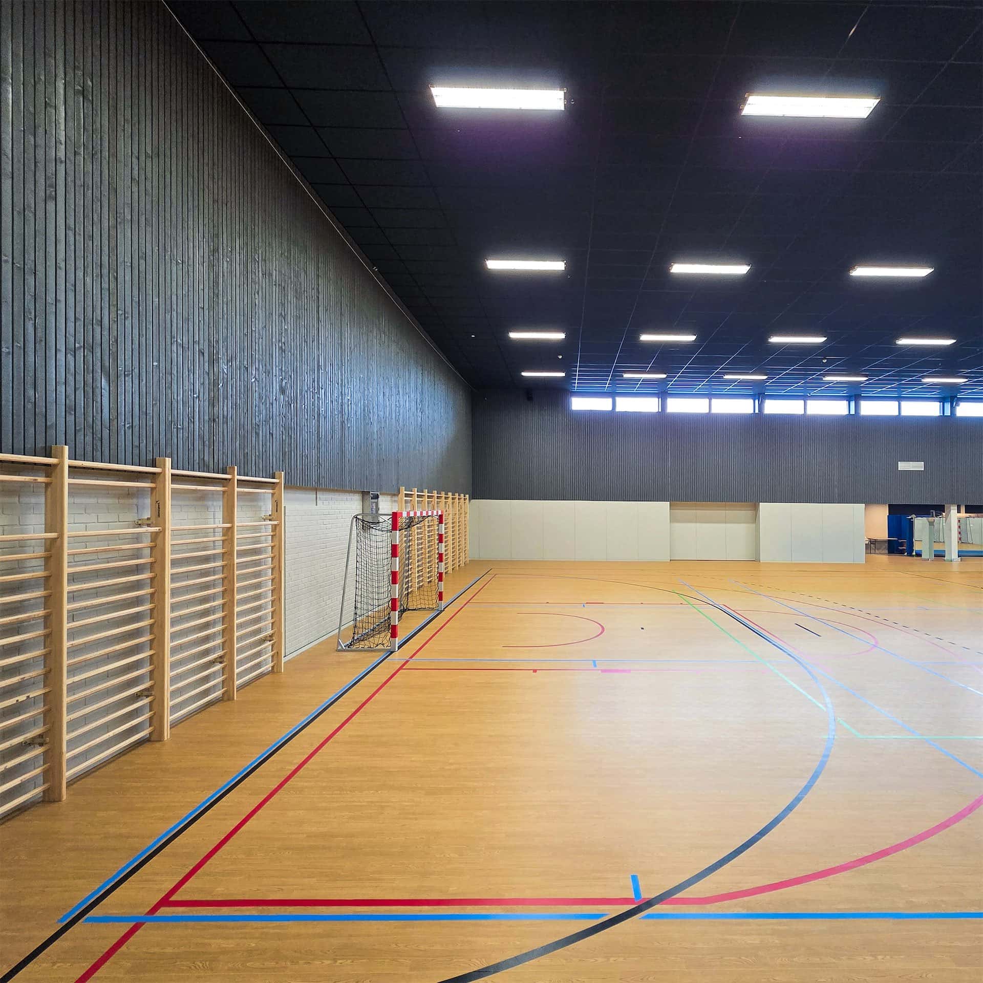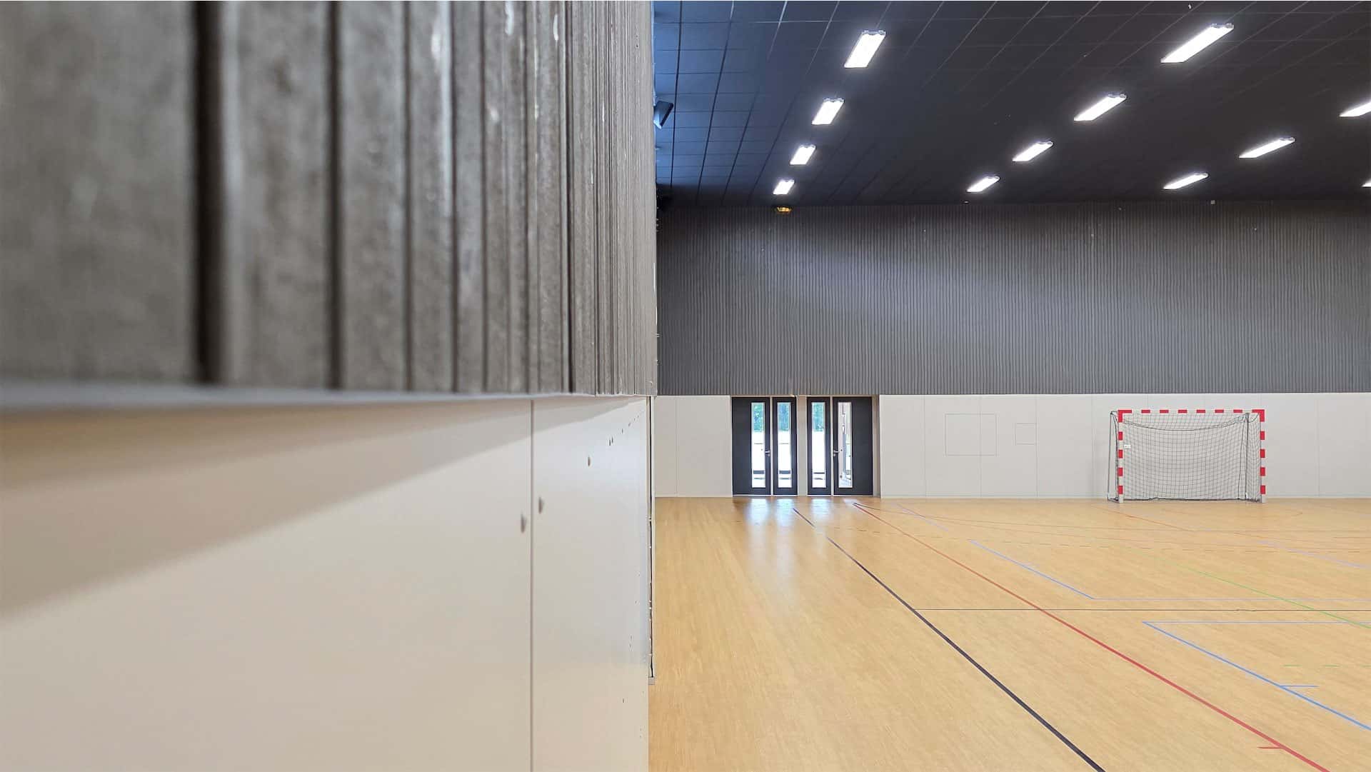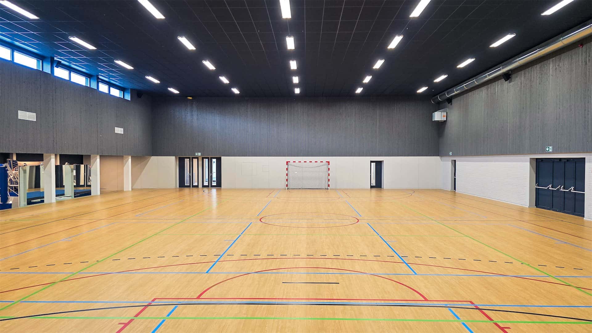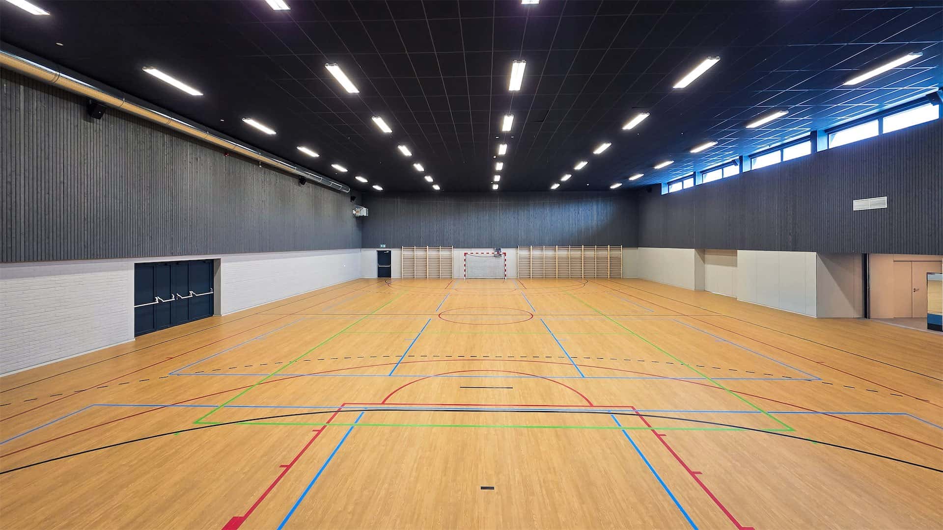 Die bestehende Sporthalle wurde energetisch saniert und mit hellen, warmen und natürlichen Materialien neugestaltet. Sie bietet Raum für sportliche wie auch kulturelle Veranstaltungen.