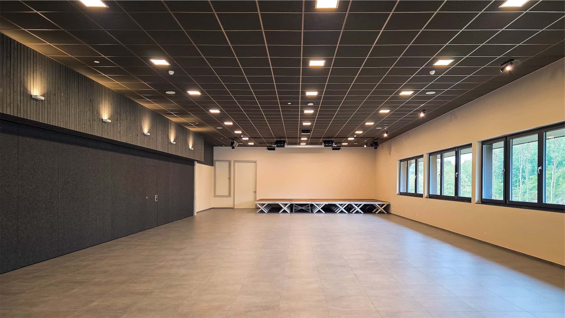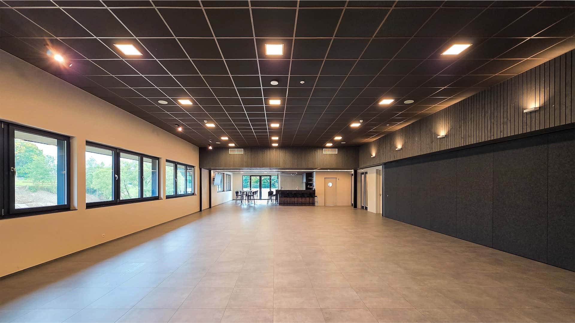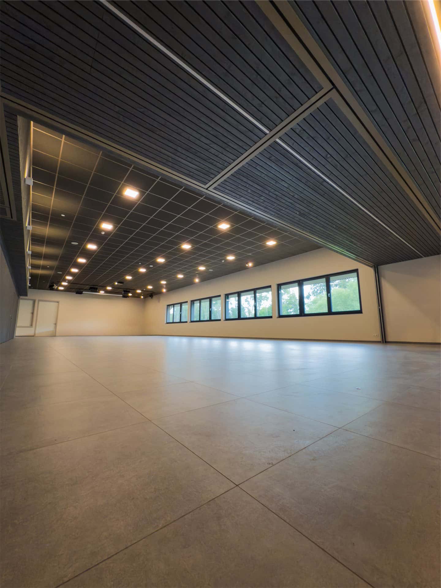 Ein besonderes Highlight ist die Verbindungsmöglichkeit zur Sporthalle über mobile Trennwände. So können bei größeren Veranstaltungen funktionale Nebenräume geschaffen und Abläufe optimal gestaltet werden. Der neue zentrale Eingangsbereich mit Foyer verbindet beide Gebäudeteile und ist einladend und offen.