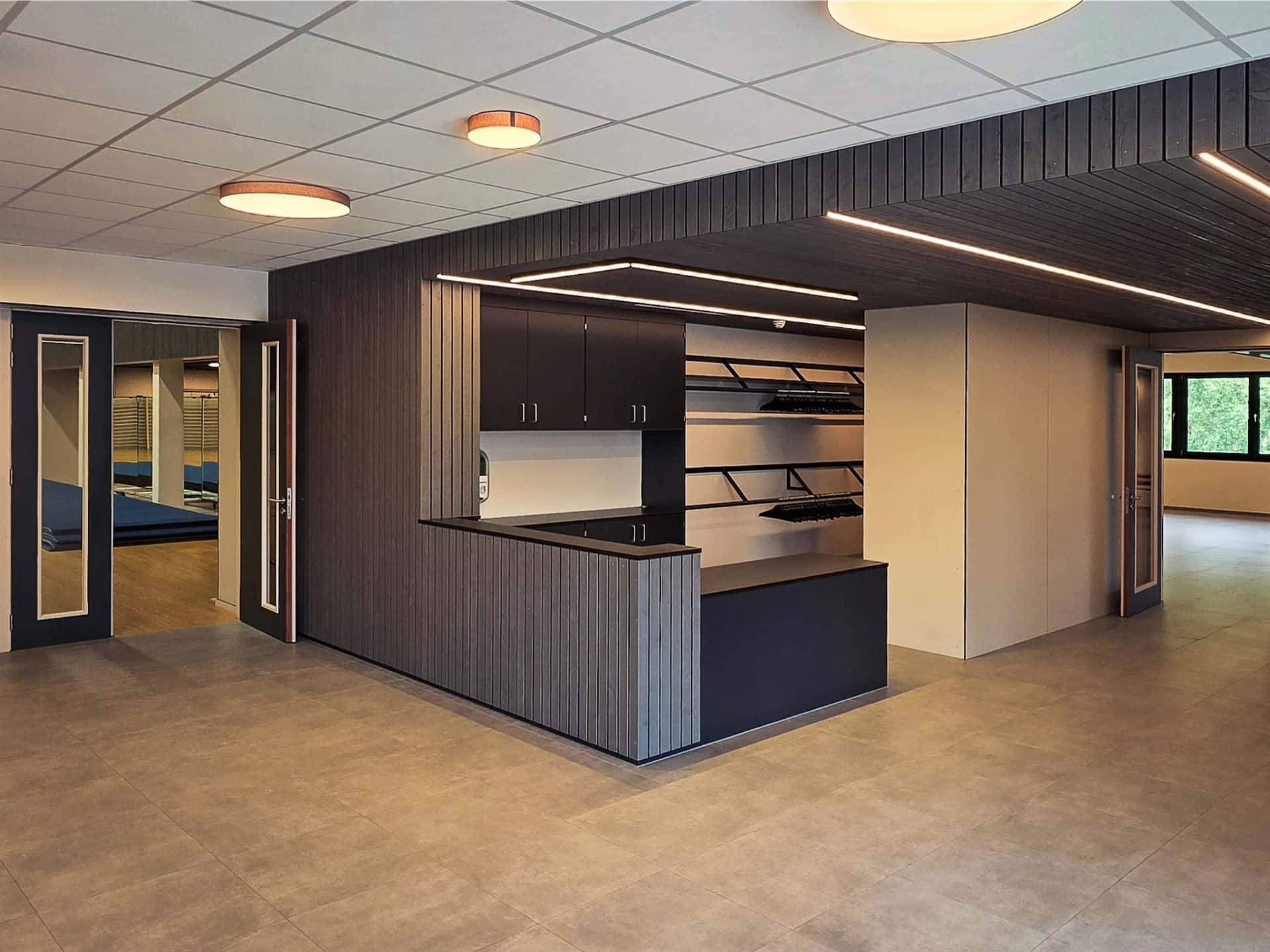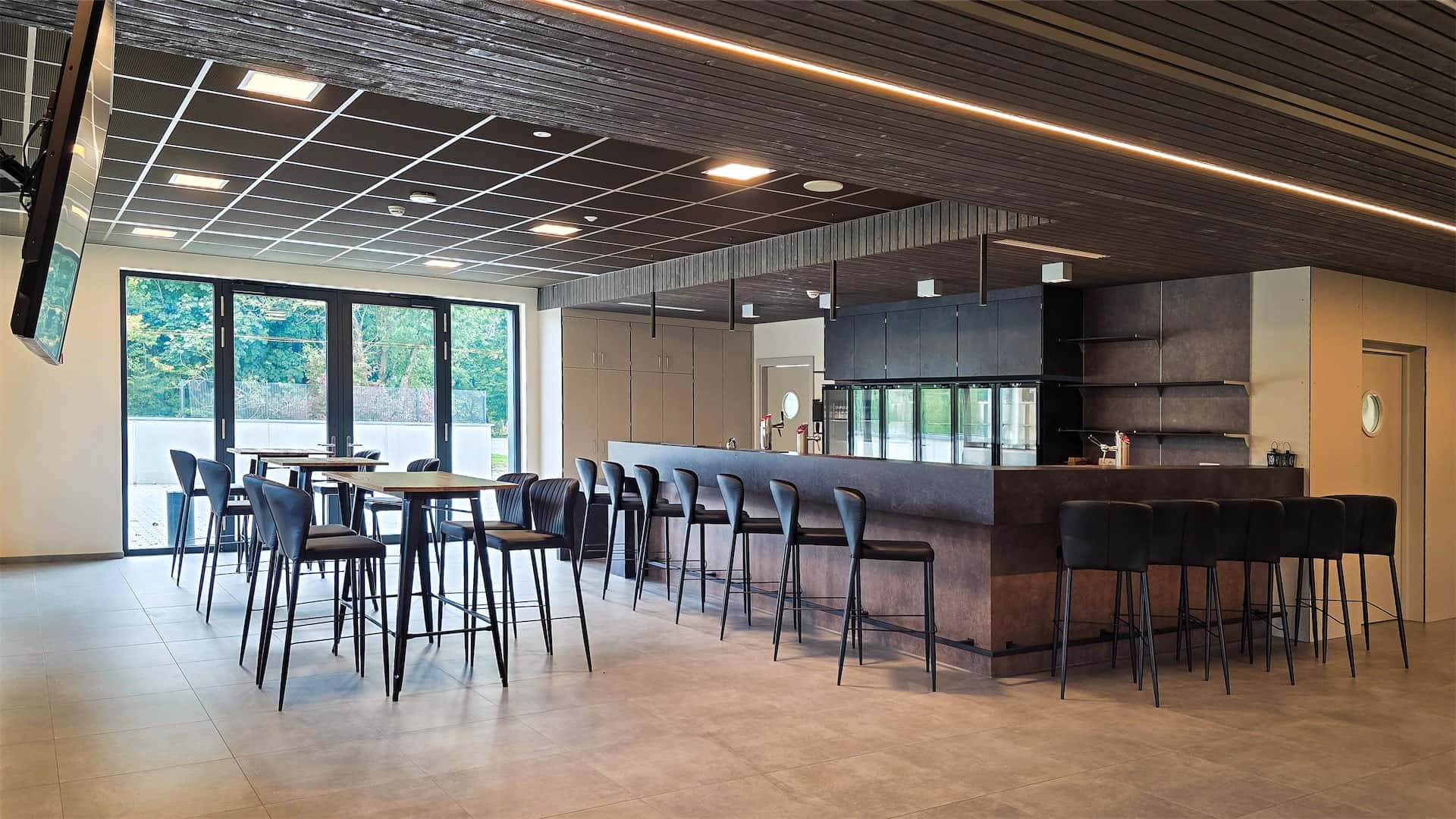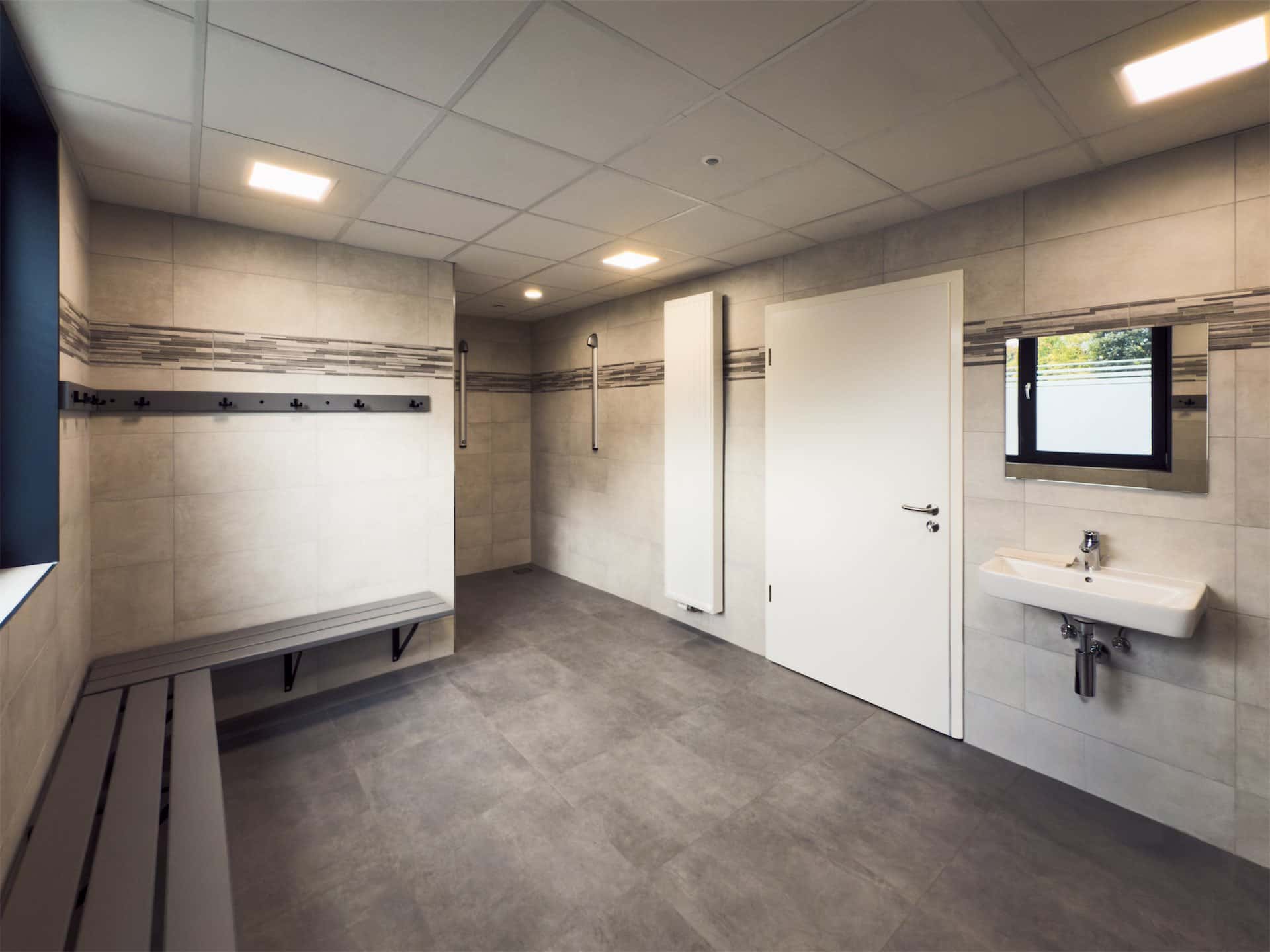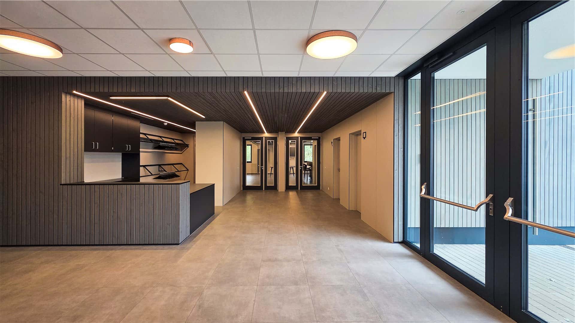 Ein besonderes Highlight ist die Verbindungsmöglichkeit zur Sporthalle über mobile Trennwände. So können bei größeren Veranstaltungen funktionale Nebenräume geschaffen und Abläufe optimal gestaltet werden. Der neue zentrale Eingangsbereich mit Foyer verbindet beide Gebäudeteile und ist einladend und offen.
