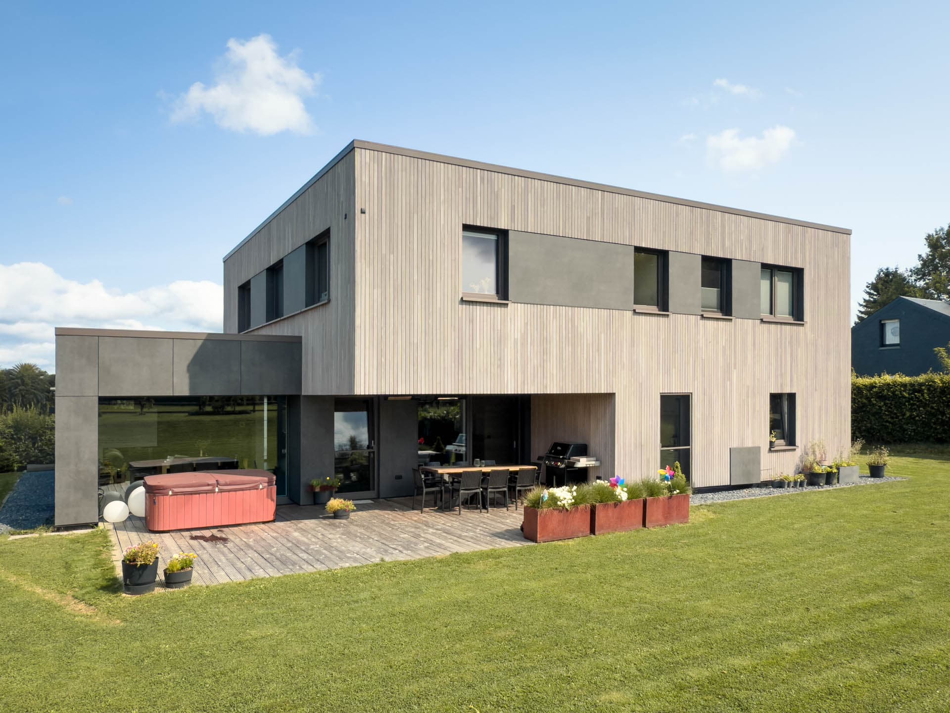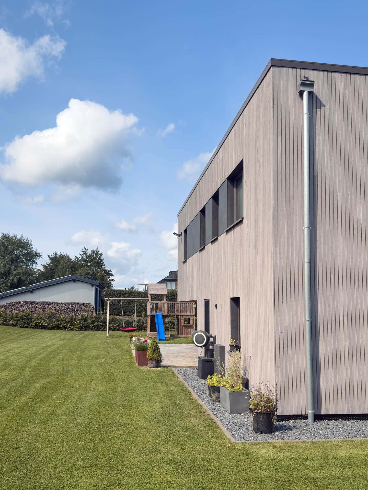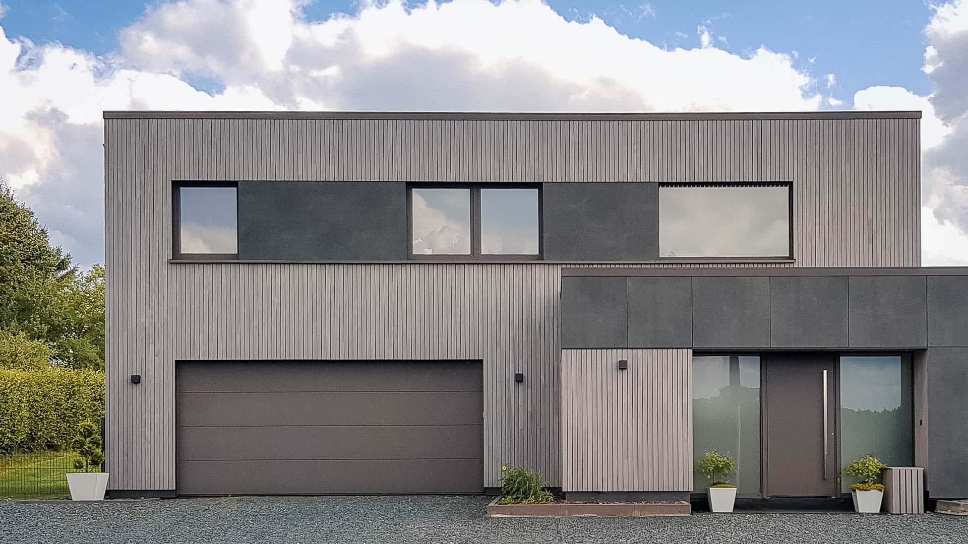 Das Gebäude besticht durch klaren, modernen Minimalismus in kubischer Formensprache. Ein zurückgesetzter Obergeschossbereich schafft eine markante Überdachung über der Terrasse und einen geschützten Außenbereich. Vertikal angeordnetes Holz bringt Wärme und Natürlichkeit, während großzügige Fensterflächen viel Licht ins Innere lassen. Großformatige graue Fassadenplatten mit exakten Fugen setzen die präzisen Linien des Entwurfs stimmig in Szene und betonen die klare, reduzierte Ästhetik.