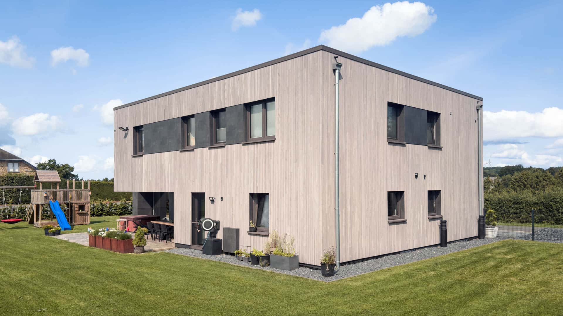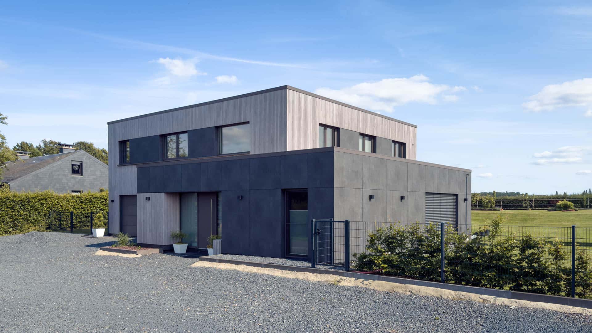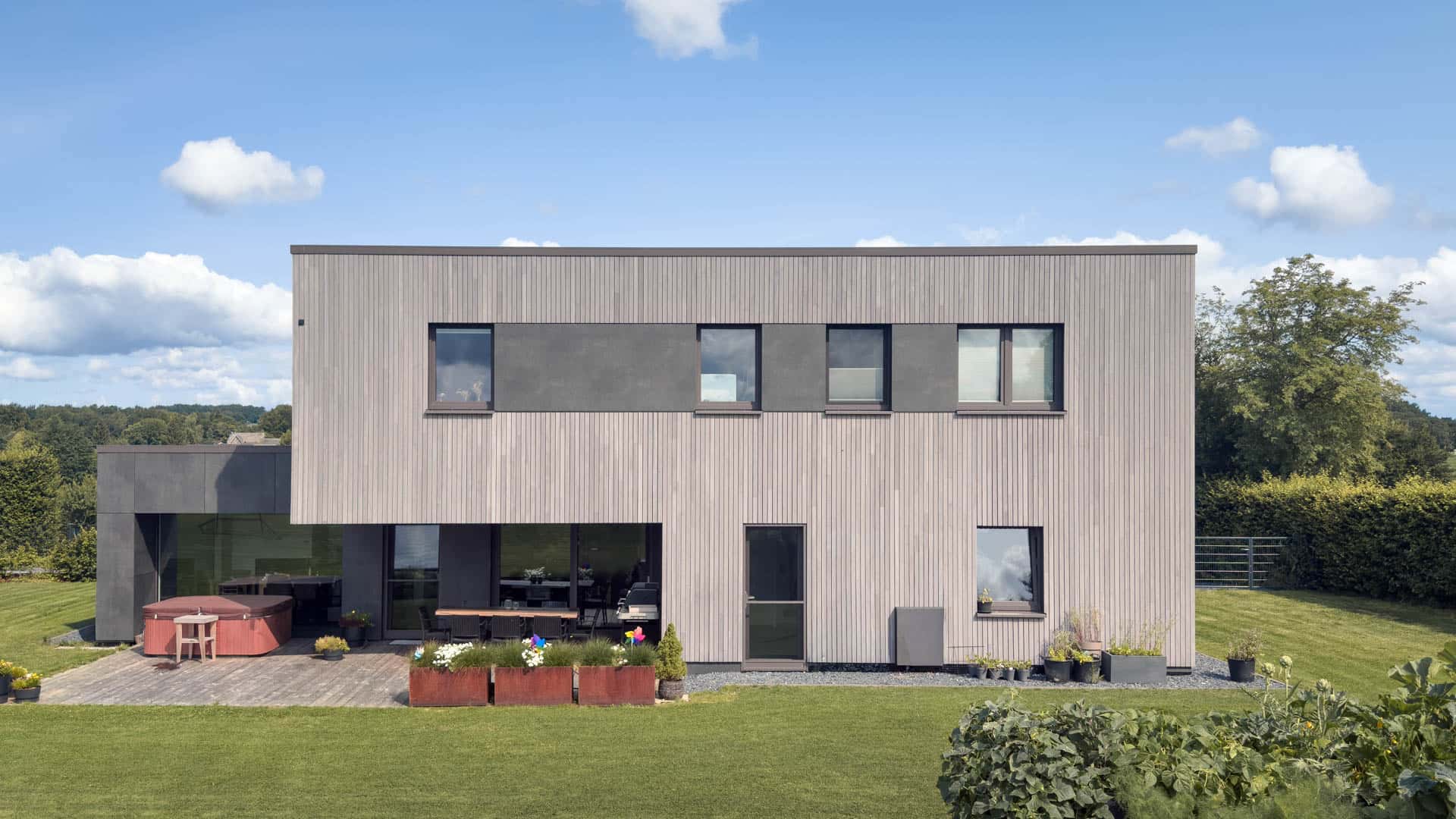 Das Gebäude besticht durch klaren, modernen Minimalismus in kubischer Formensprache. Ein zurückgesetzter Obergeschossbereich schafft eine markante Überdachung über der Terrasse und einen geschützten Außenbereich. Vertikal angeordnetes Holz bringt Wärme und Natürlichkeit, während großzügige Fensterflächen viel Licht ins Innere lassen. Großformatige graue Fassadenplatten mit exakten Fugen setzen die präzisen Linien des Entwurfs stimmig in Szene und betonen die klare, reduzierte Ästhetik.